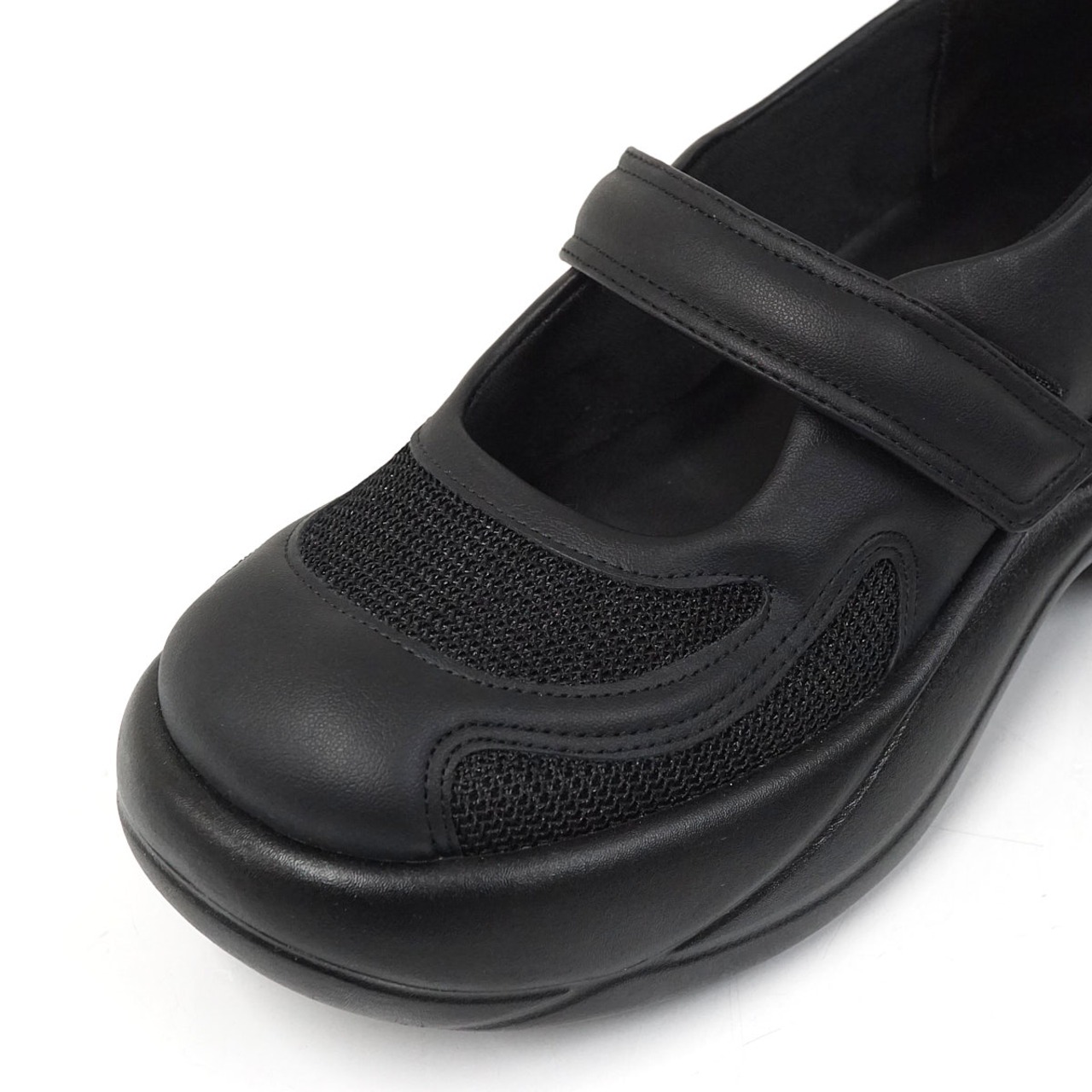 合皮レザー×メッシュの異素材を組み合わせたアッパーに、マジックテープ式のストラップを添えて、モード感漂うスタイリッシュなデザインに仕上げました。
