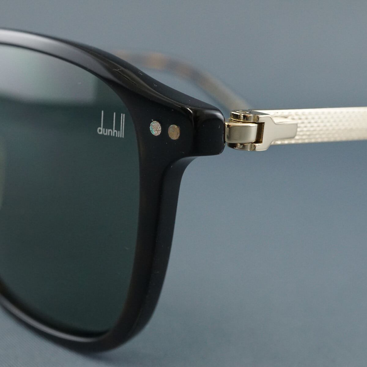 べっ甲デザインのスッキリとした細身のフレーム、テンプル部分のdunhillマークでブランドをアピール。