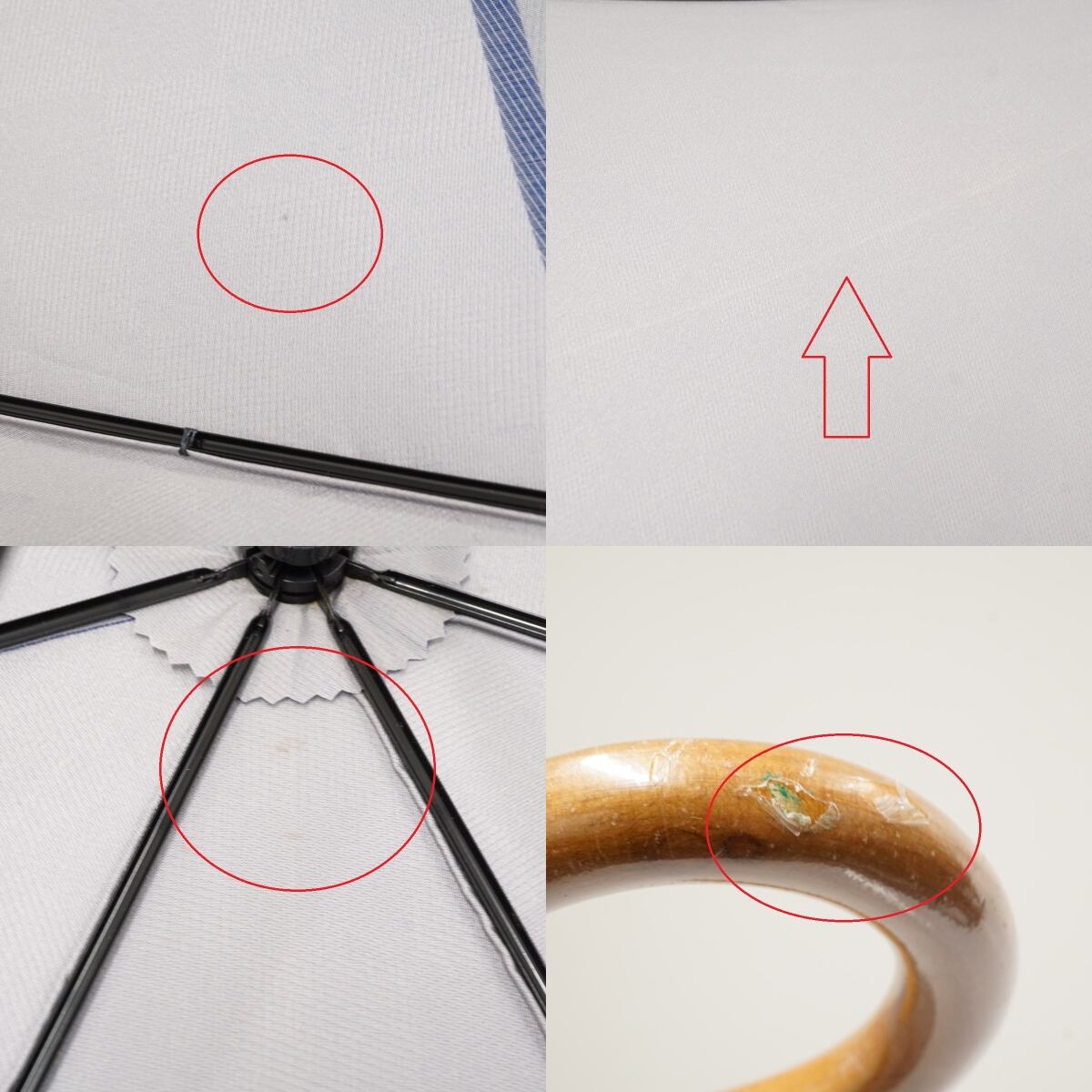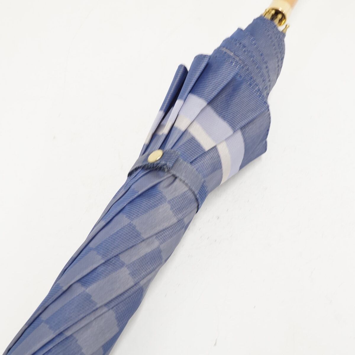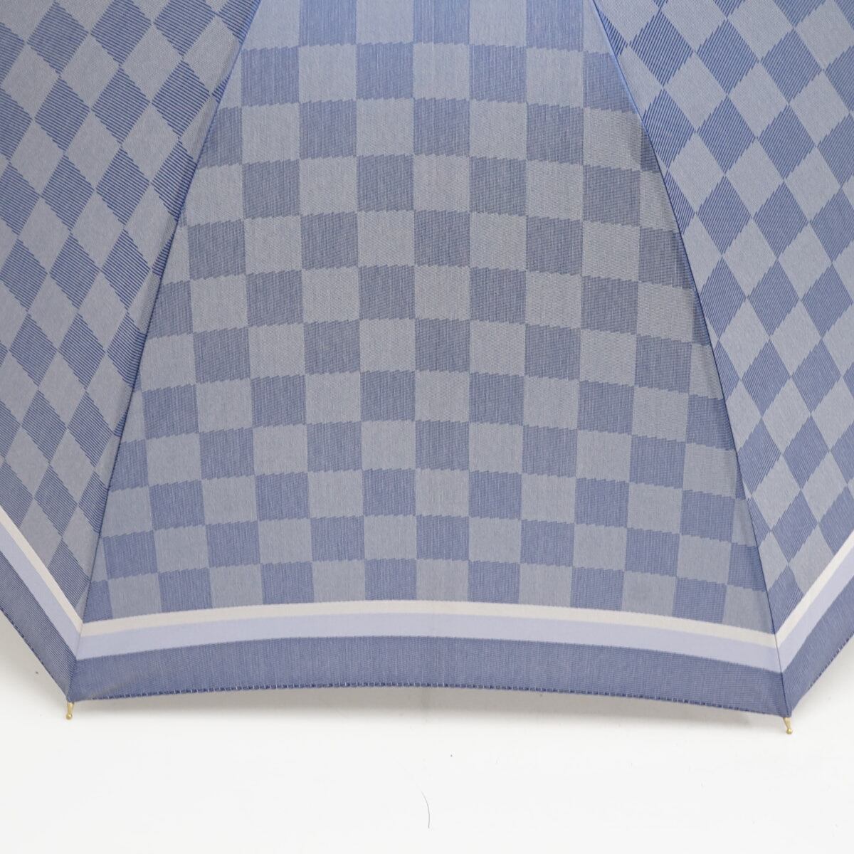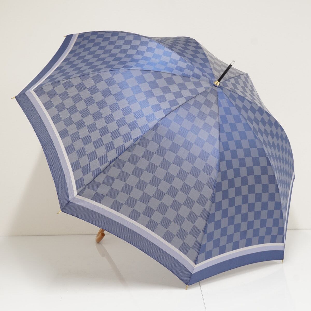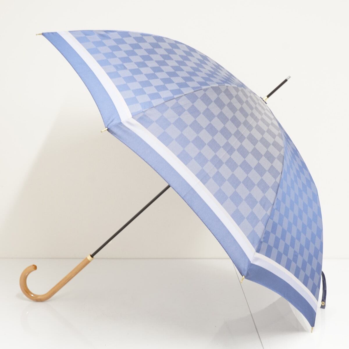 傘 福島化成工業(株) USED美品 チェック 市松模様 ブルー 木製手元 高級傘 おしゃれ 60cm A3367