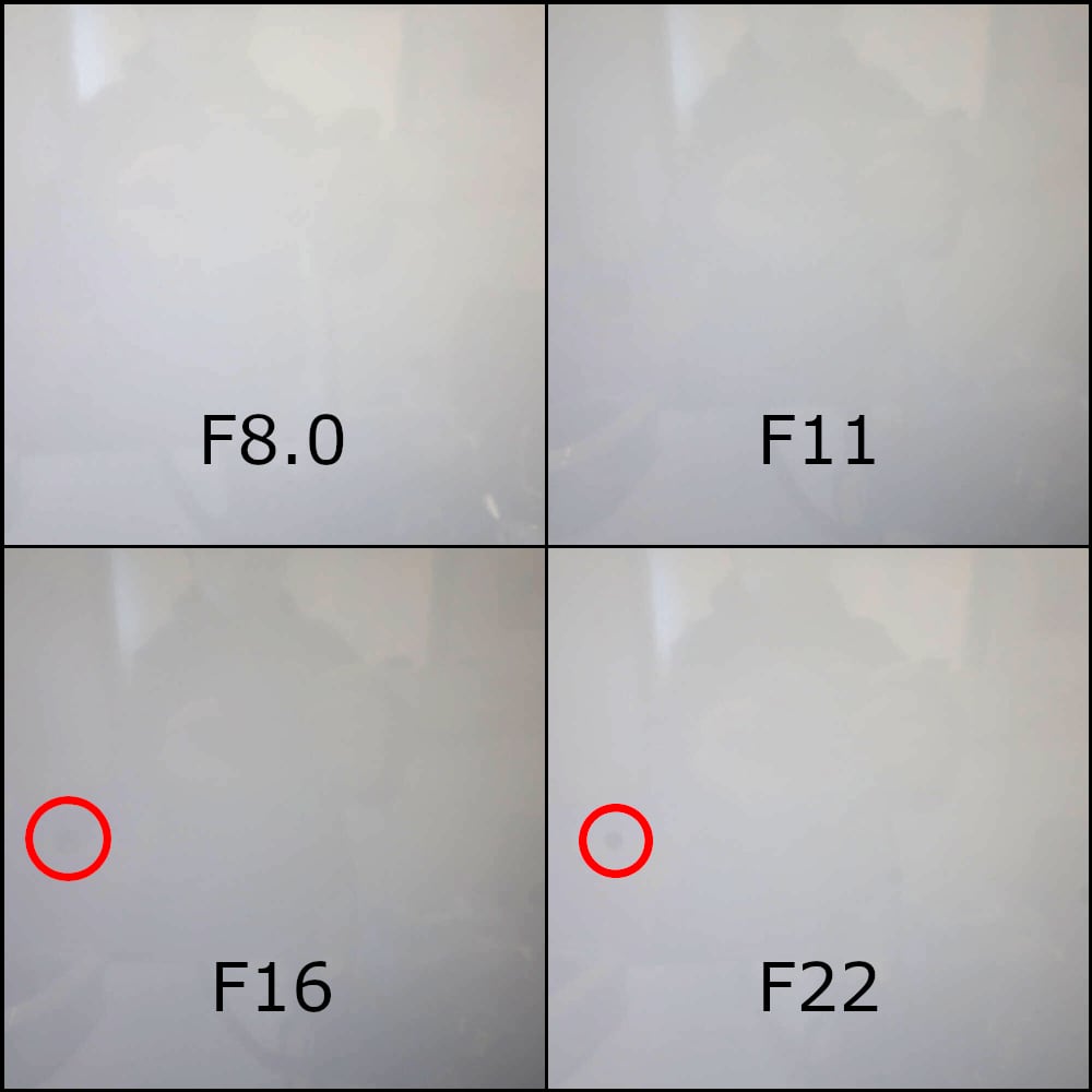 後玉のチリの混入の影響により、F値を絞ると影が写り込みます(画像をご確認ください)。