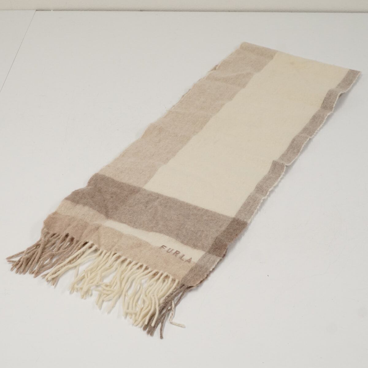 FURLA フルラ ストール USED品 レディース ブロックチェック ロゴ刺繍 ブランド 秋冬 オフ×ベージュ X8613