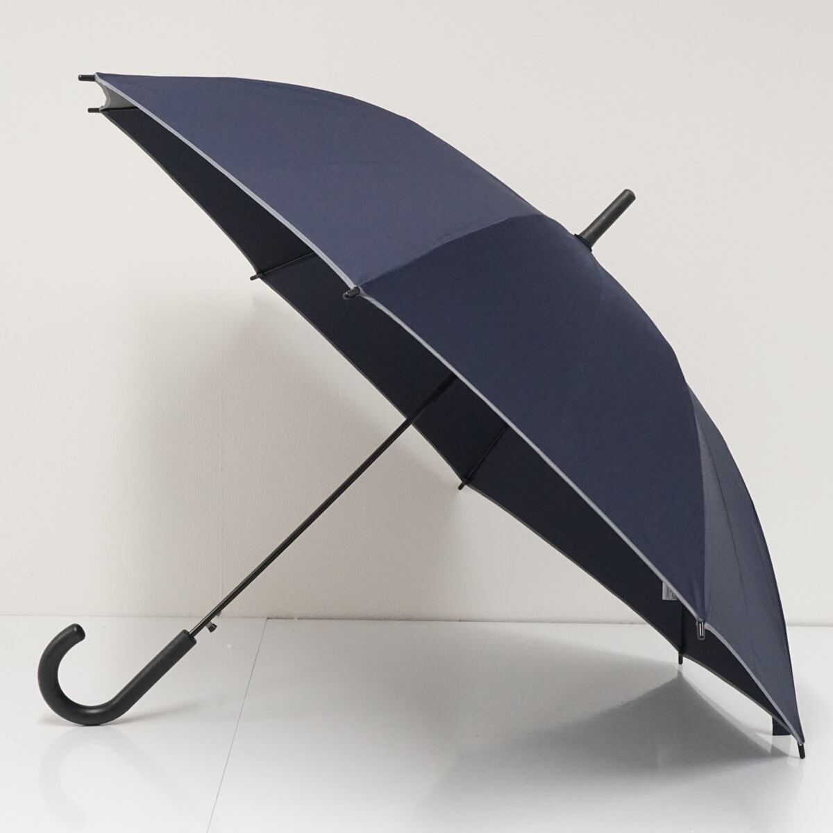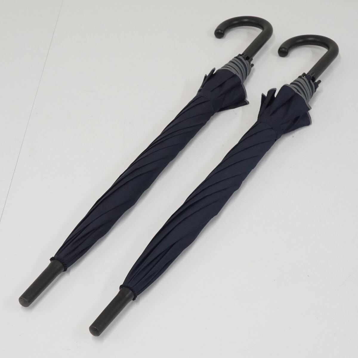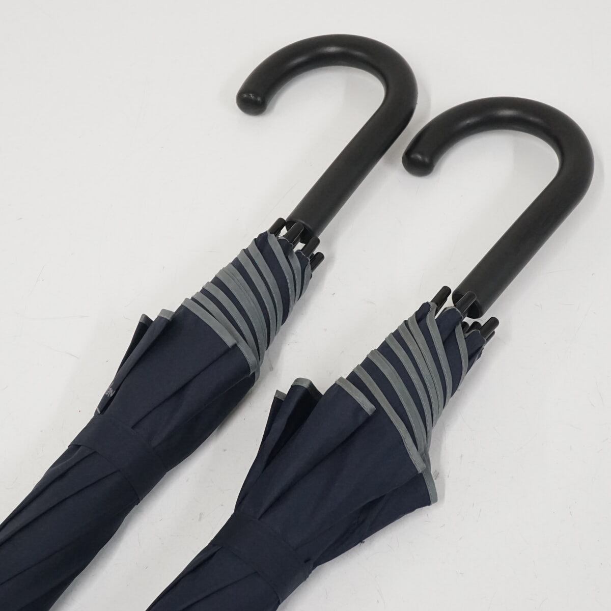 お色は暗めのネイビー(縁がグレー)の2本セットで、側面にワンポイントのシンプルなデザインですので、通学用の傘としてもお使いいただけます。