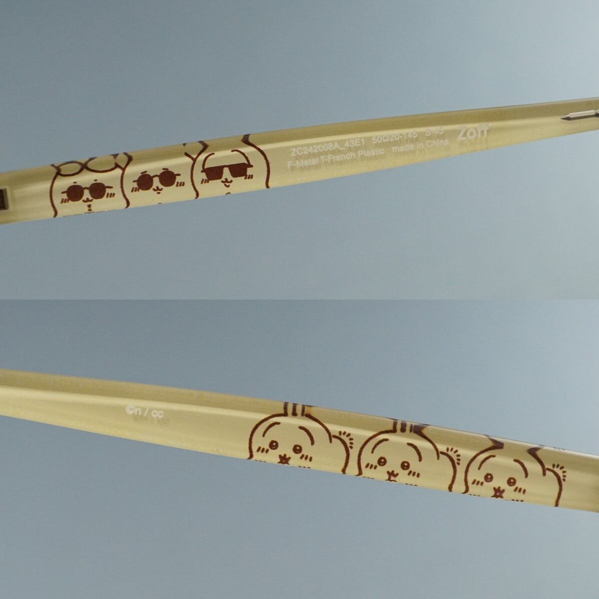 右のテンプル(つる)には『うさぎ』と、左にはサングラスをかけた『ちいかわ』『ハチワレ』『うさぎ』がなかよく並んでいます。