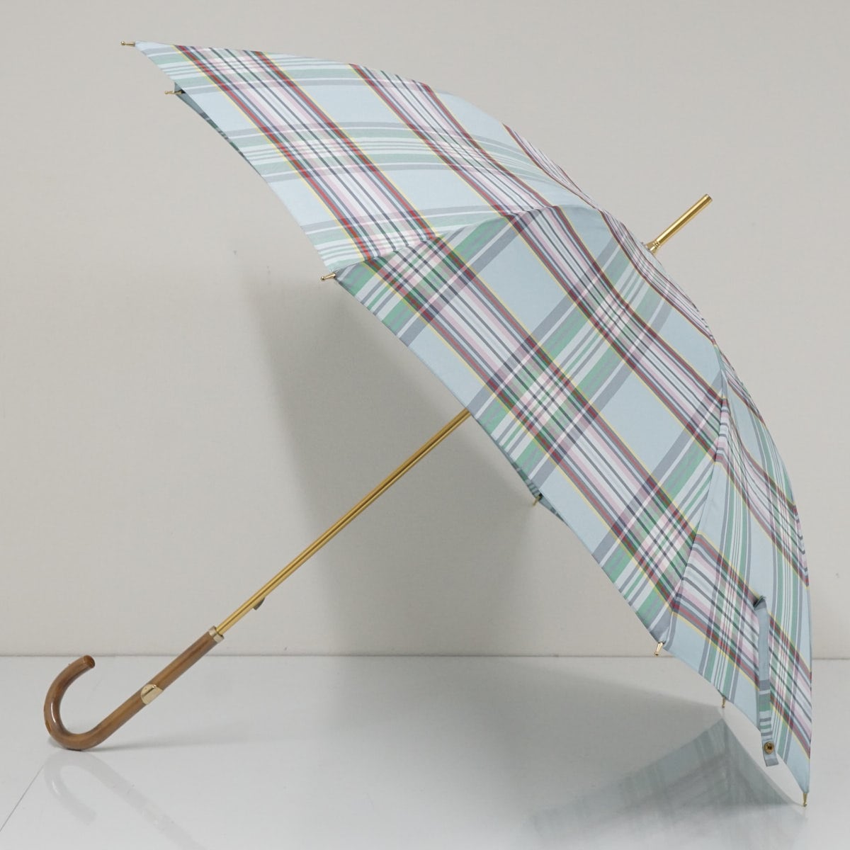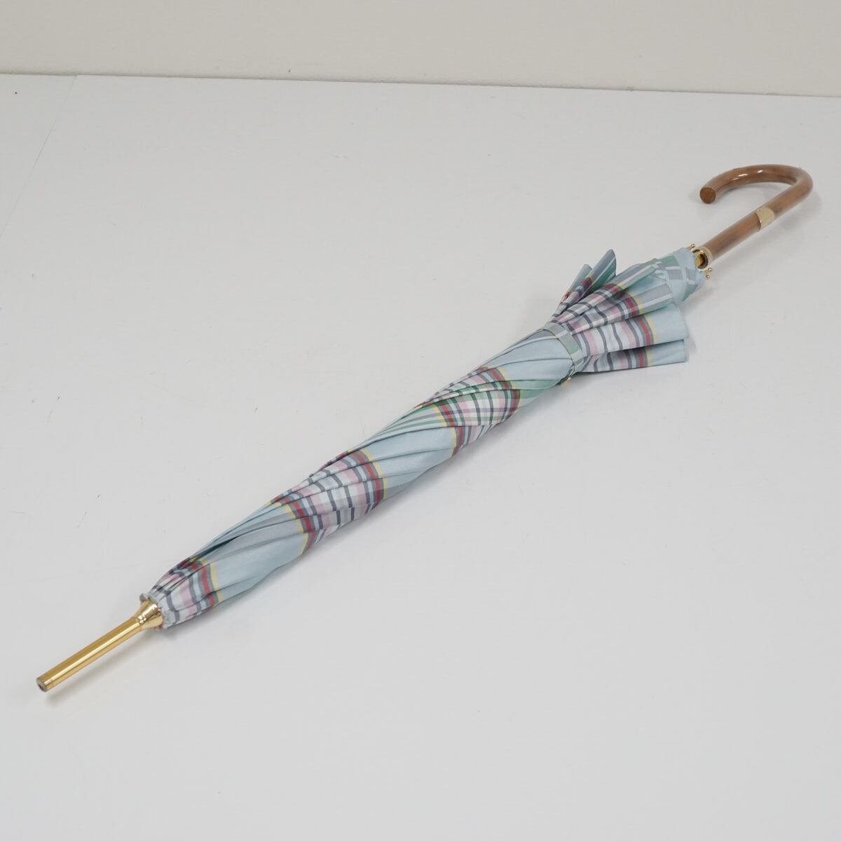 傘 Polo Ralph Lauren ラルフローレン 高級傘 USED美品 チェック ライトブルー 木製手元 60cm S3408
