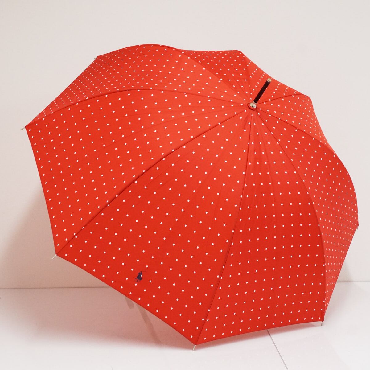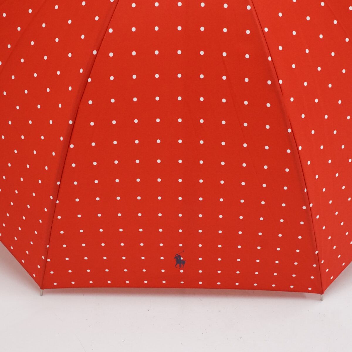 レッド×ホワイトドットの生地にネイビーのポロマークをプリントした「ポロラルフローレン」のアンブレラです。
