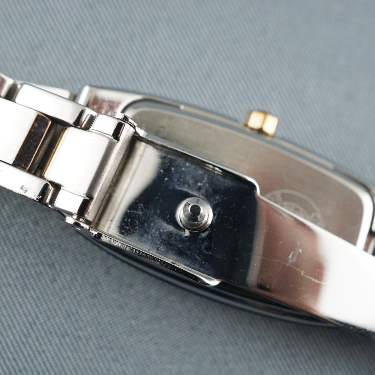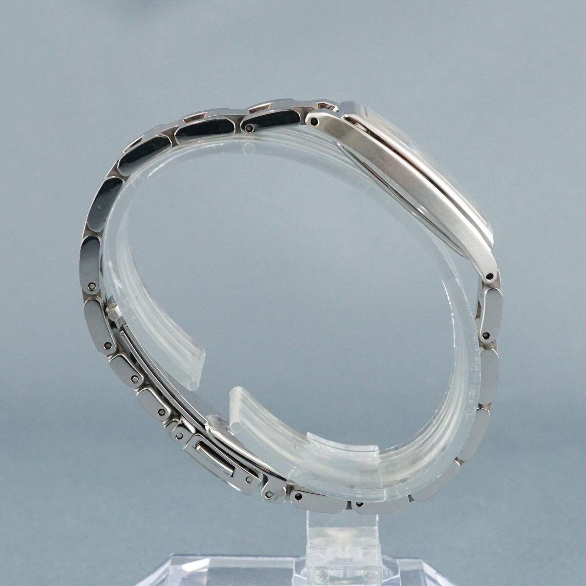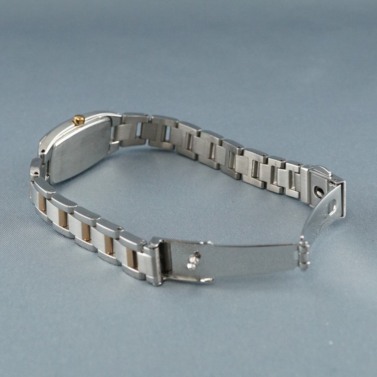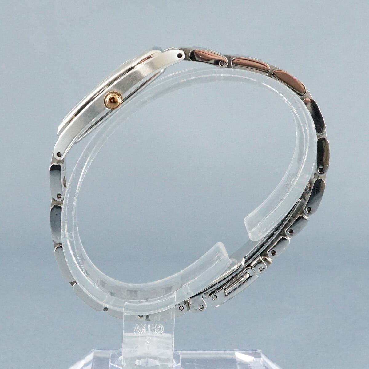 レクタンギュラー型のケースに、ホワイトの文字盤とローズゴールドのパーツが上品でおしゃれな一品です。