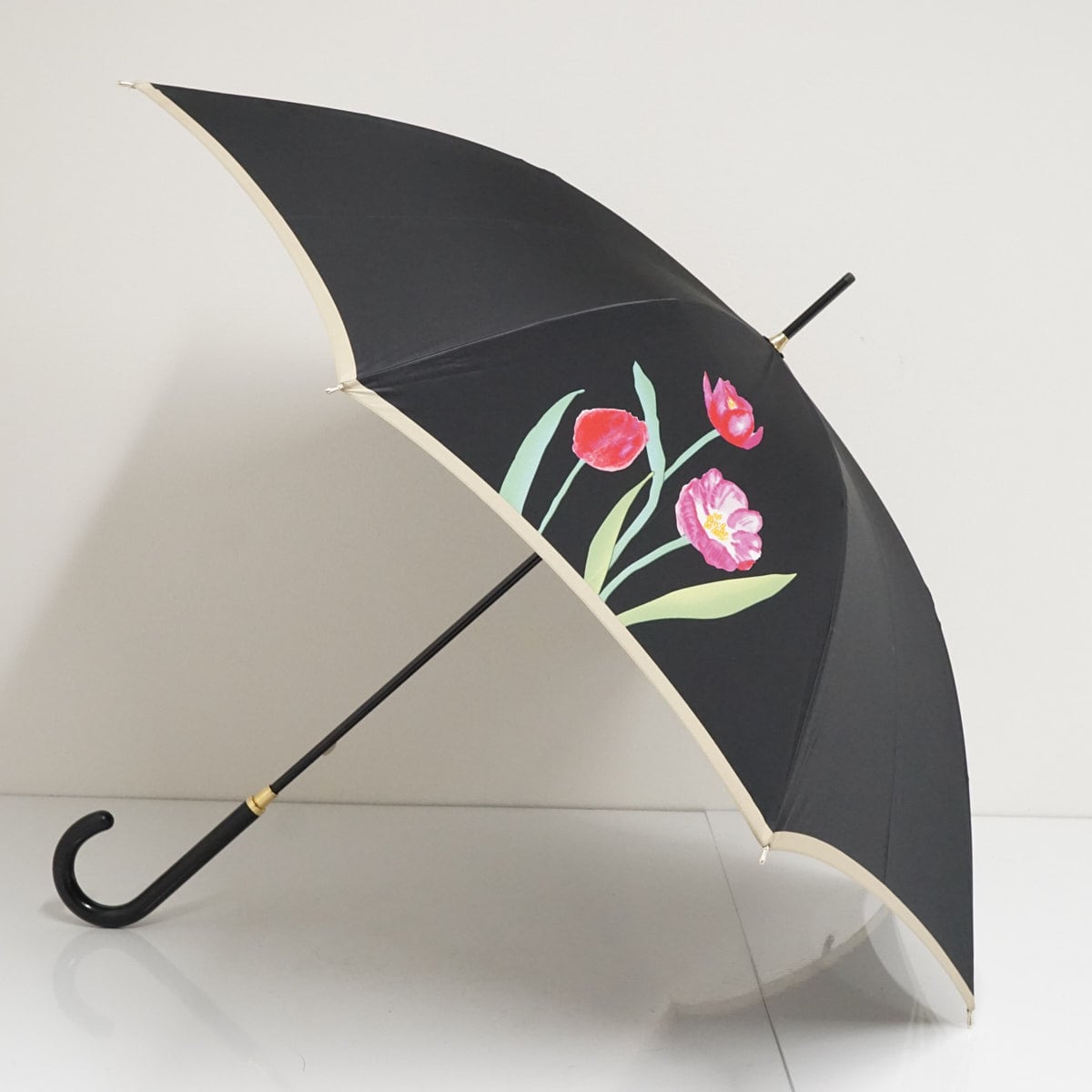 光沢のあるブラックカラーの生地に、大きめなチューリップが華やかでおしゃれです。