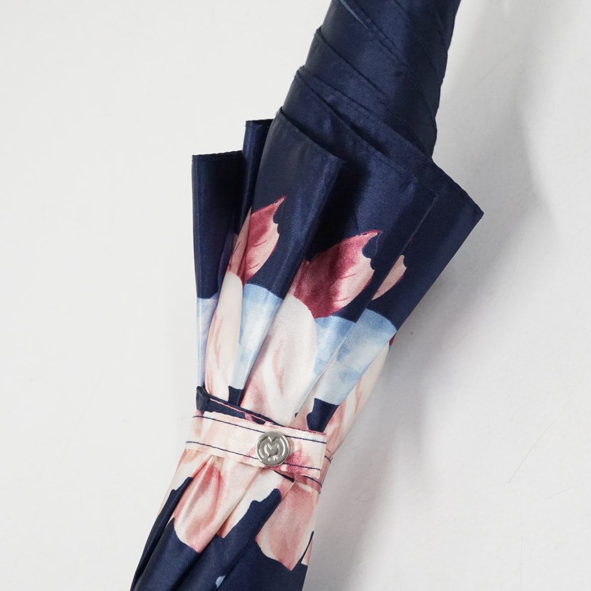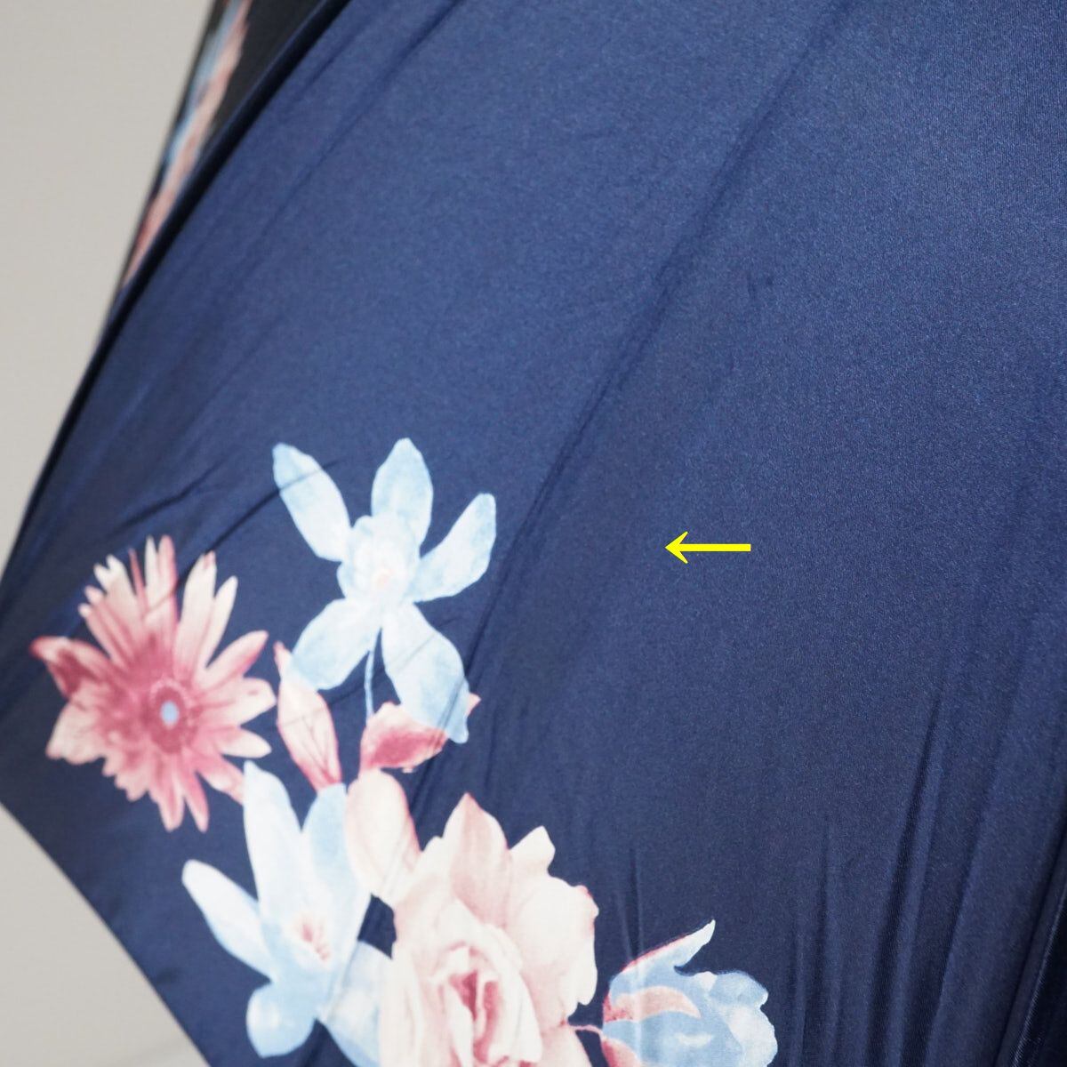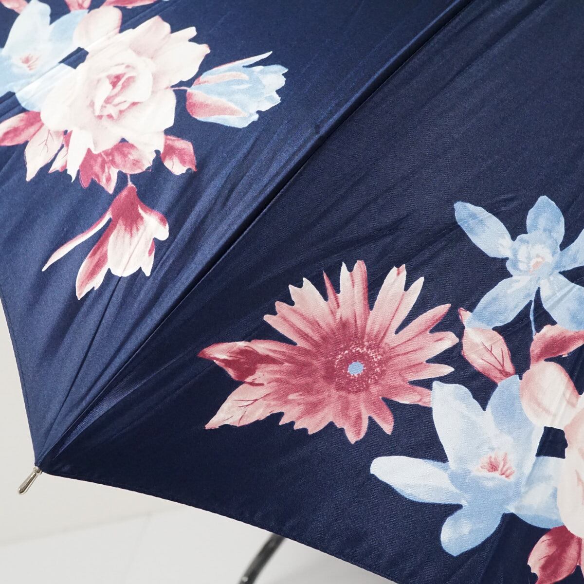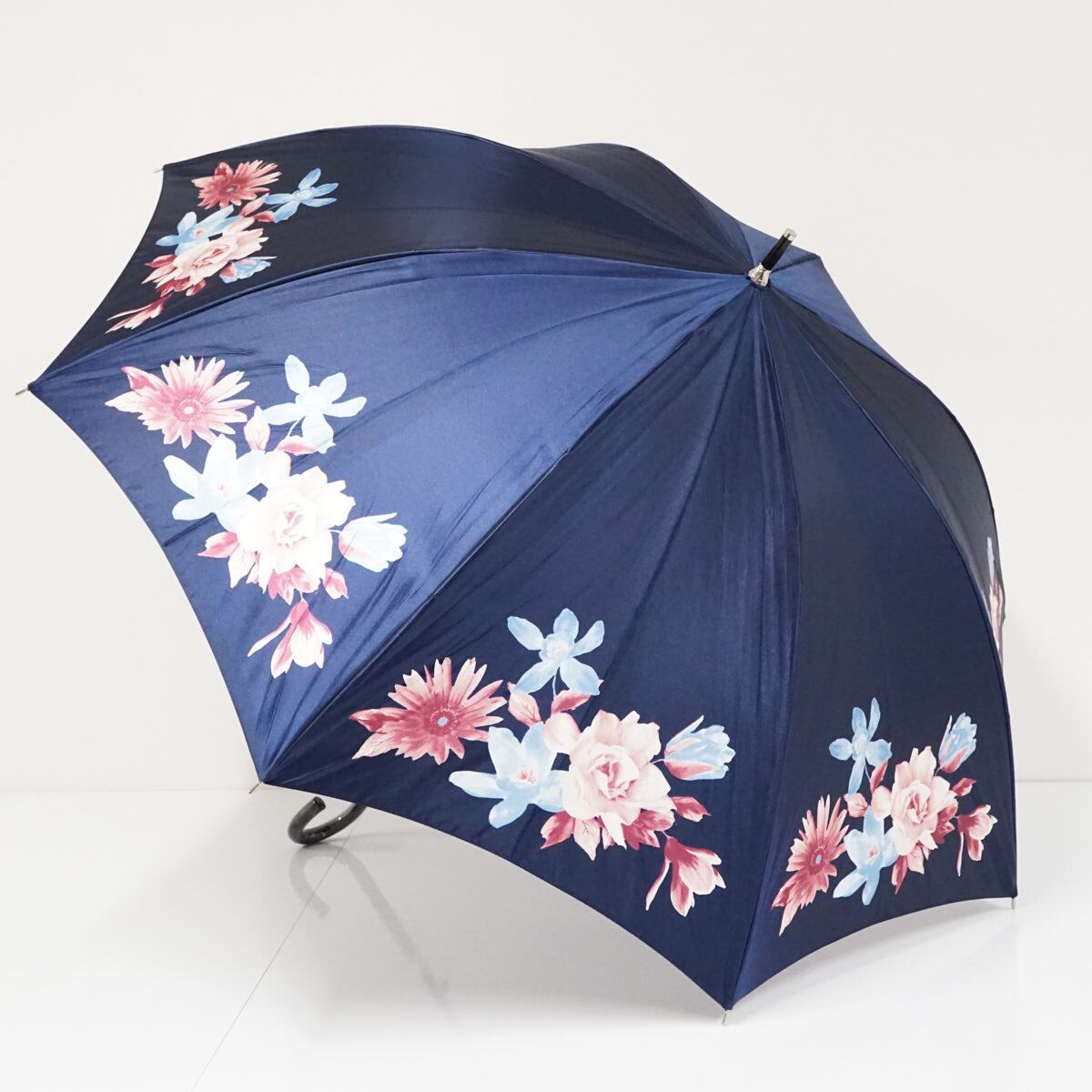 光沢のあるネイビーの生地をベースにフラワーモチーフが描かれたエレガントなデザインです。