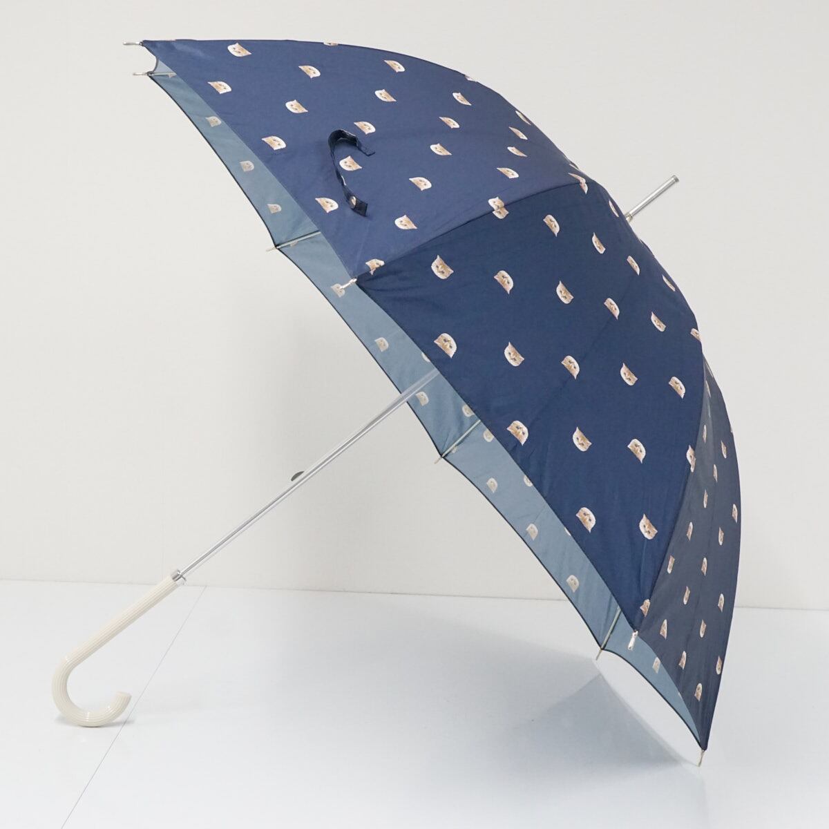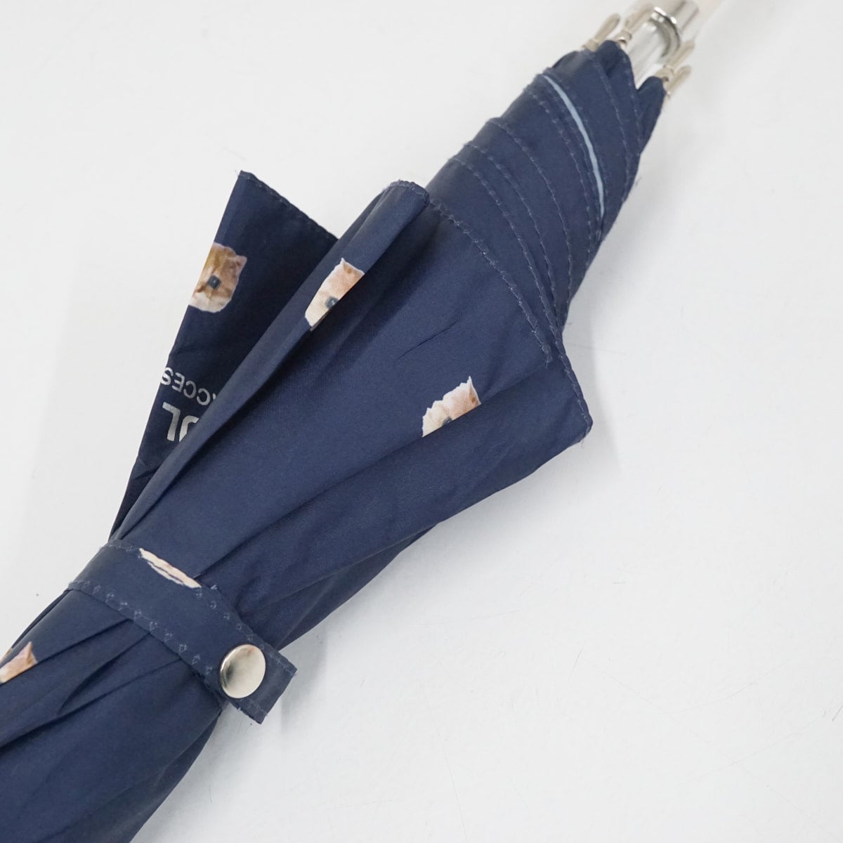 ドットプリント、そして思わず見つめたくなるつぶらな瞳のキャットフェイスが描かれたキュートなルックスの長傘です。