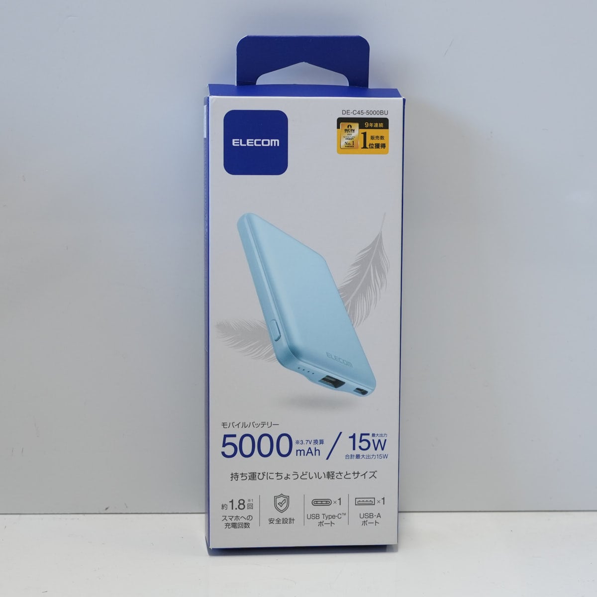 エレコム モバイルバッテリー 新品 5000mAh 15W 5V 3A Type-C USB-A ケーブル付属 ブルー 軽量 小型 薄型 充電器 DE-C45-5000BU X9284