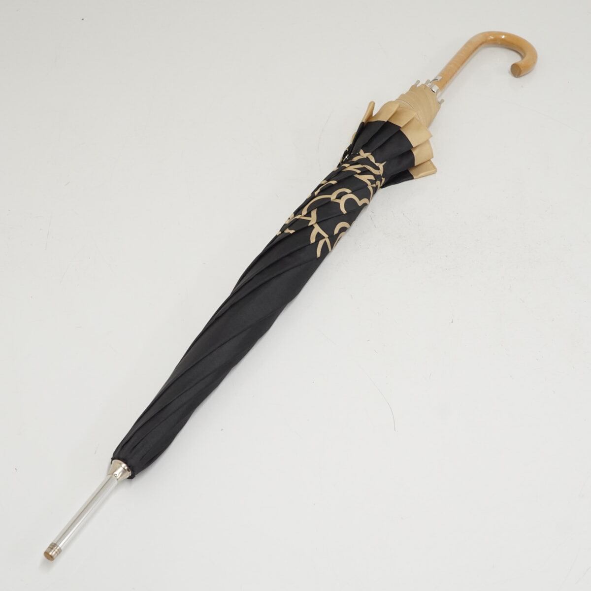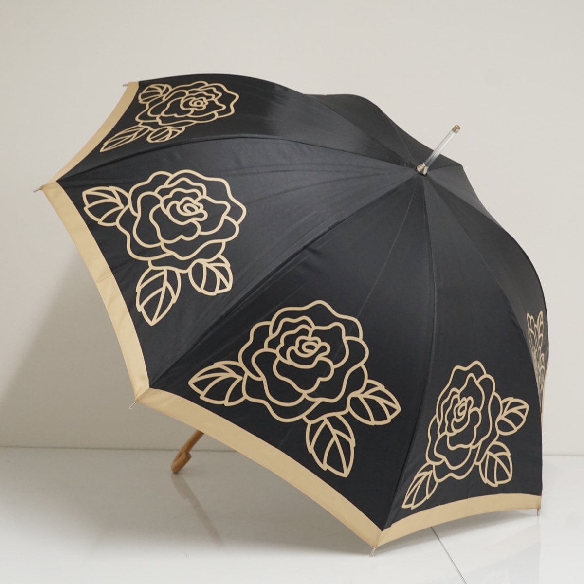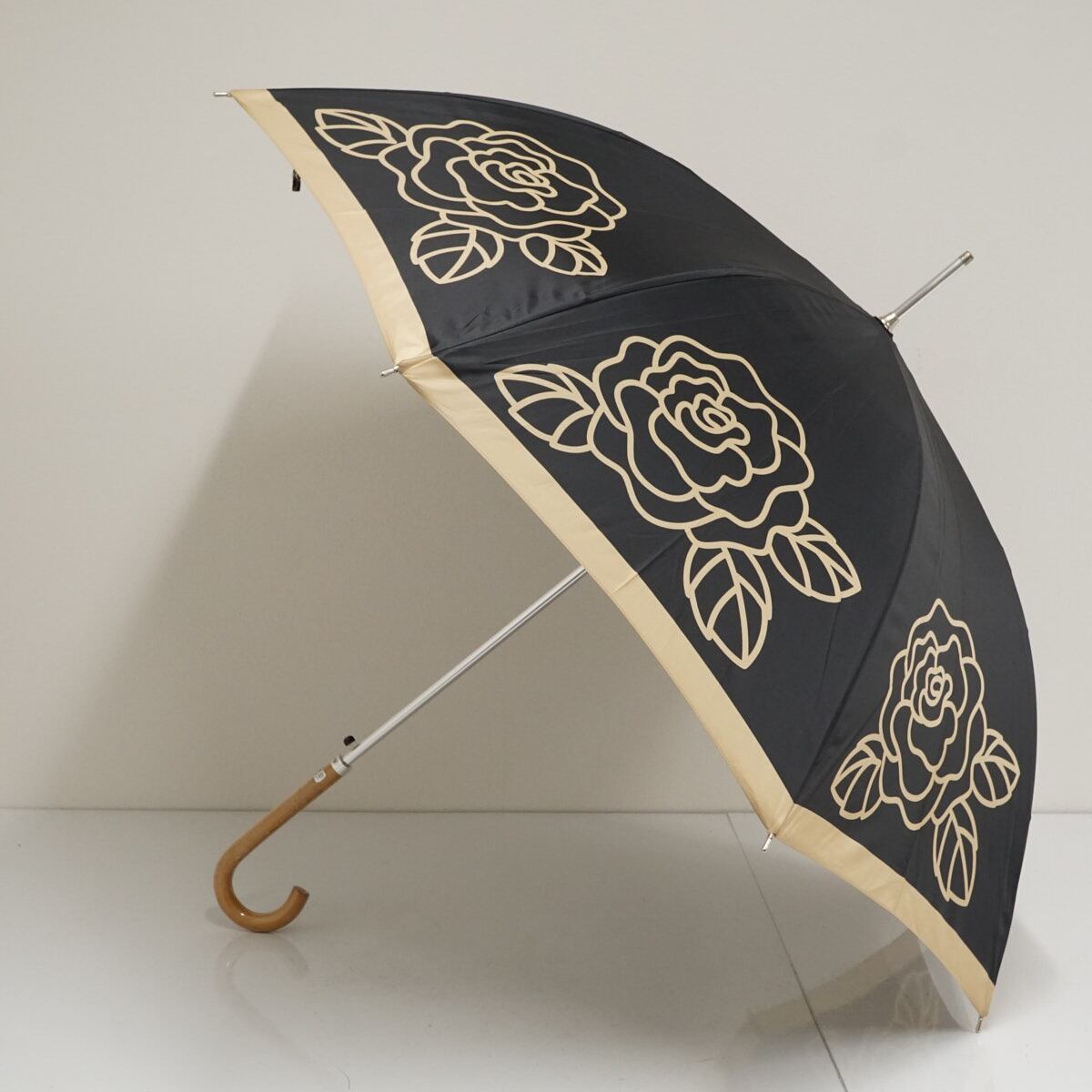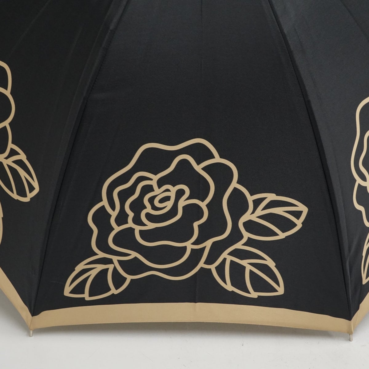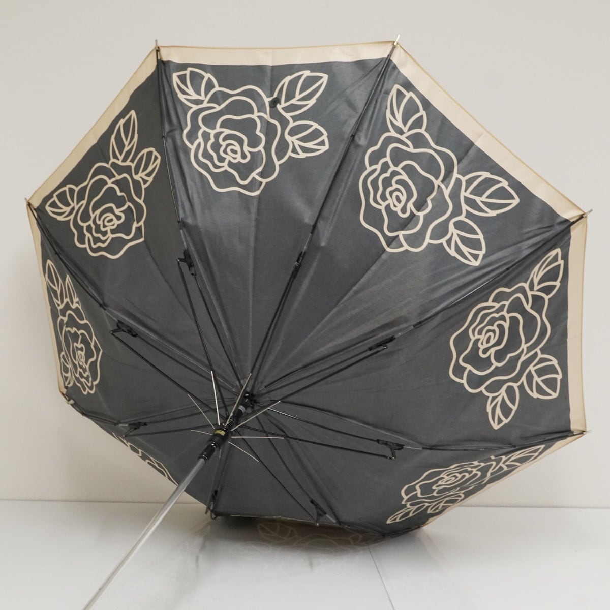 耐風傘 Borsalino ボルサリーノ USED美品 薔薇 フラワー レディース ブラック×ベージュ グラス骨 60cm A3564