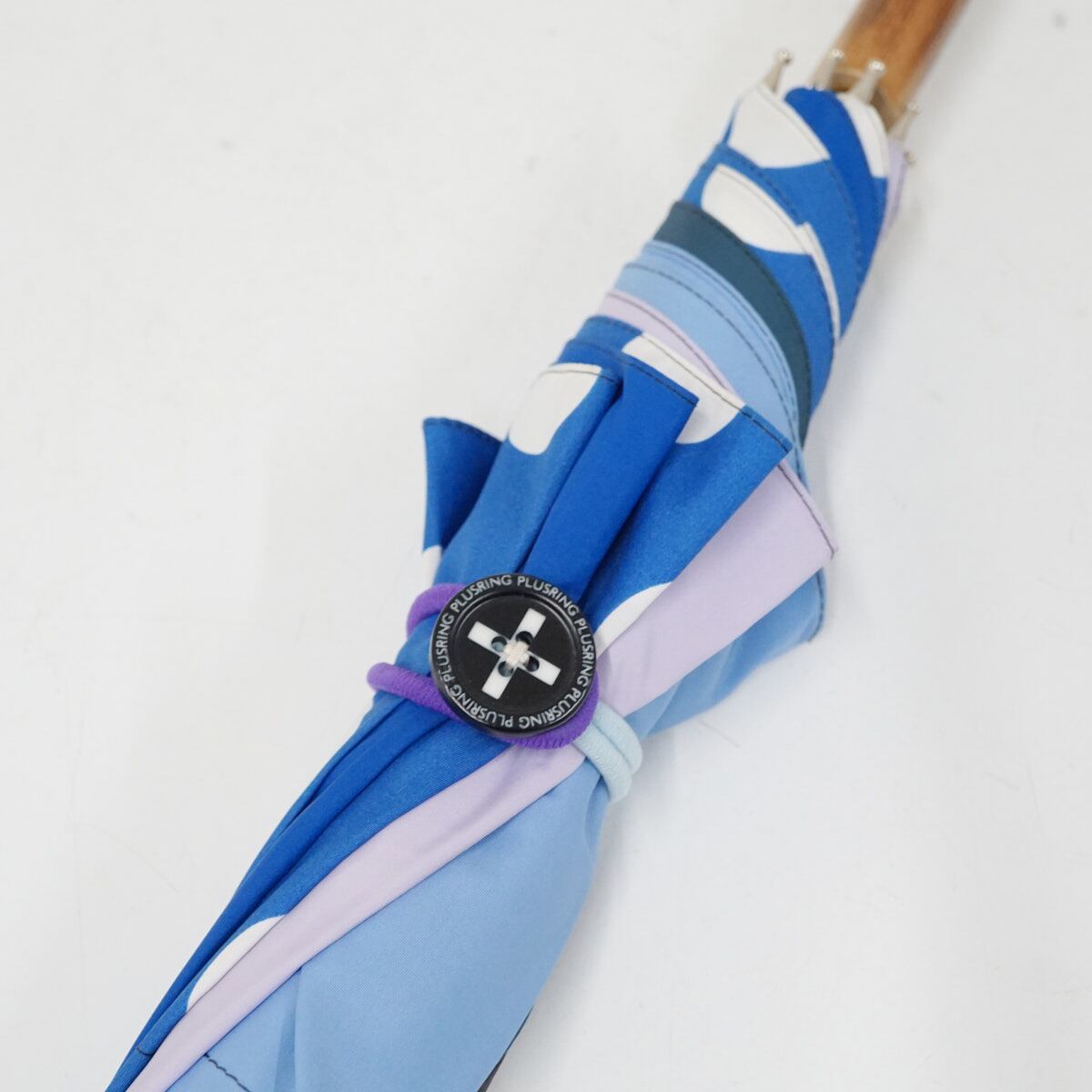 PLUSRINGと刻印されたボタンに、ゴムバンドのストラップを引っかける簡単仕様になっており、左右どちらから巻いても傘を束ねてしまうことができます。