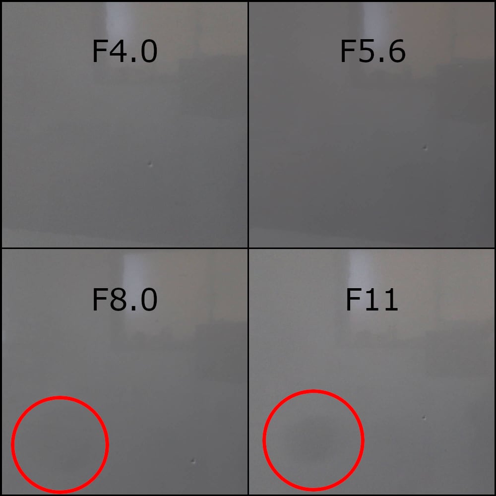 F値を絞ると撮影結果に薄い影が写り込みます(画像をご確認ください)。