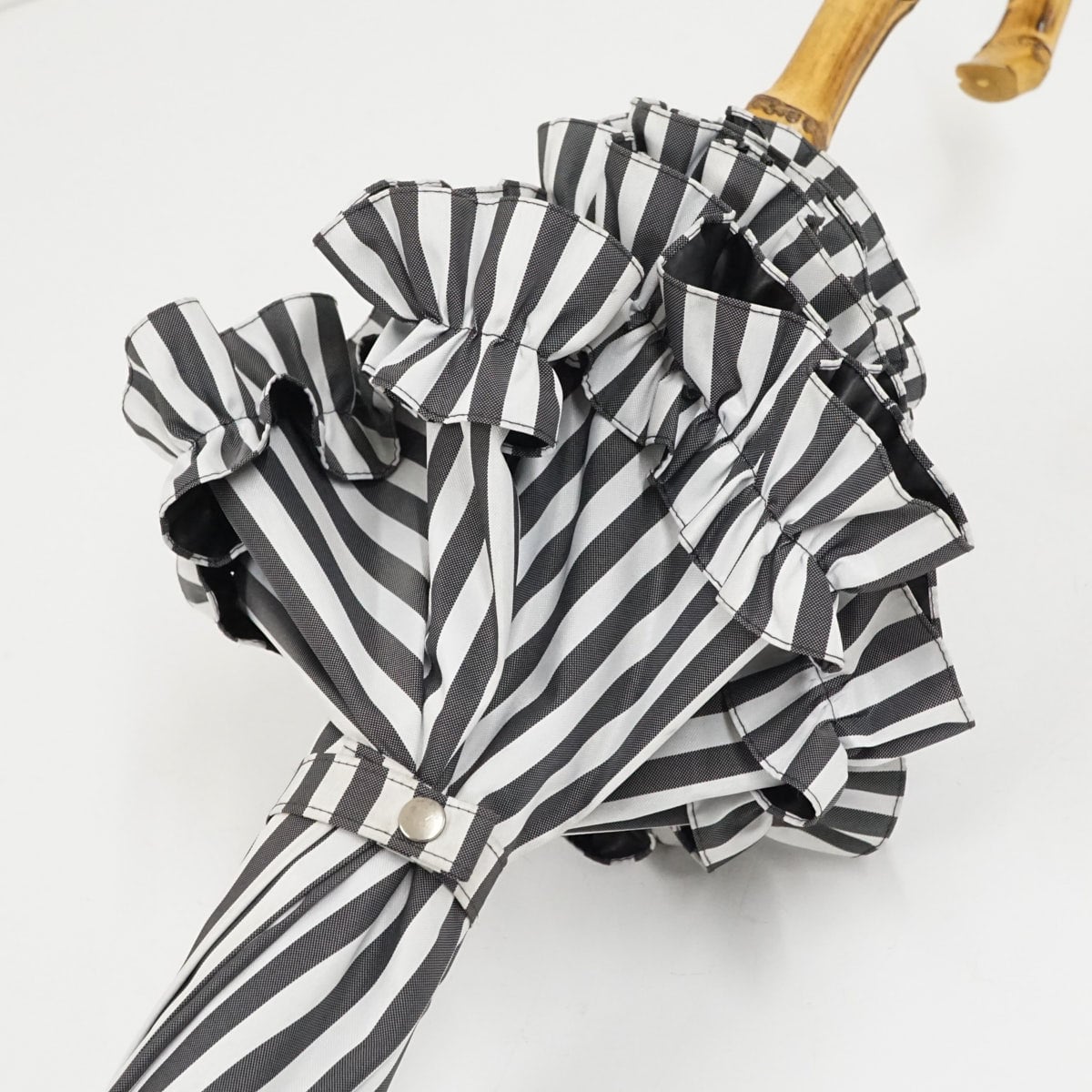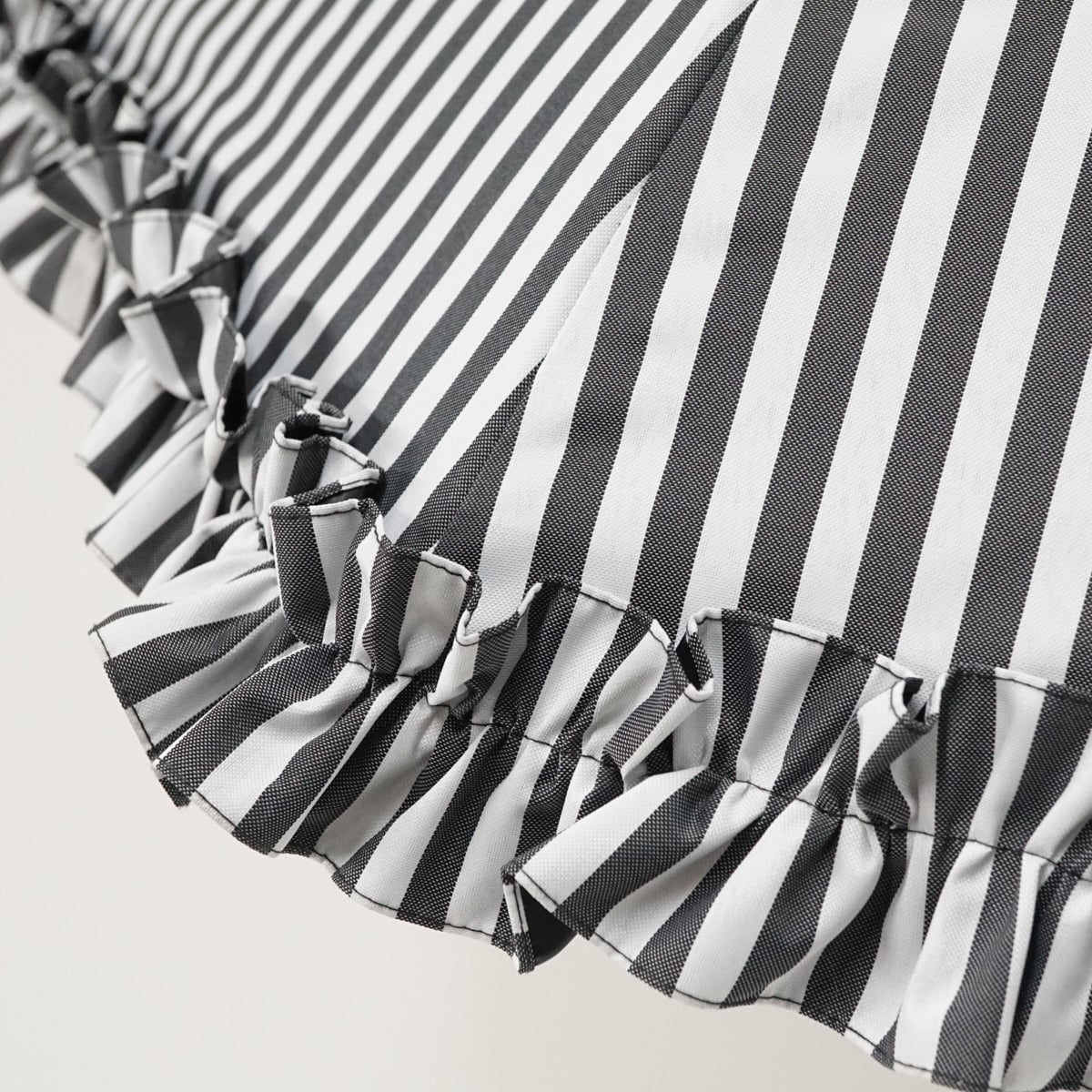 白黒のストライプとフリルが印象的なデザインです。