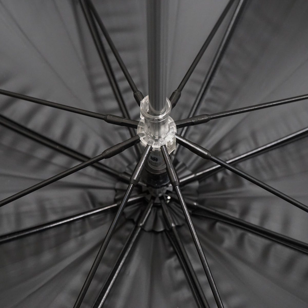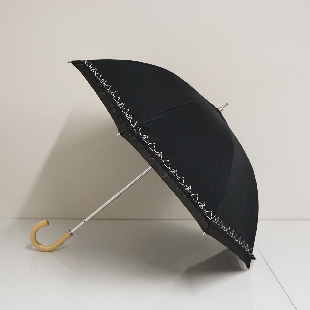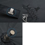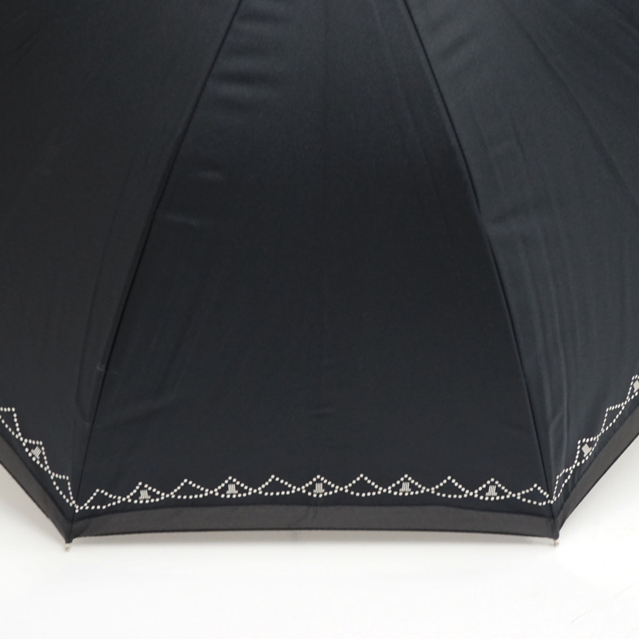 ブラックを基調に、外周をブランドロゴで囲ったデザインの晴雨兼用日傘です。