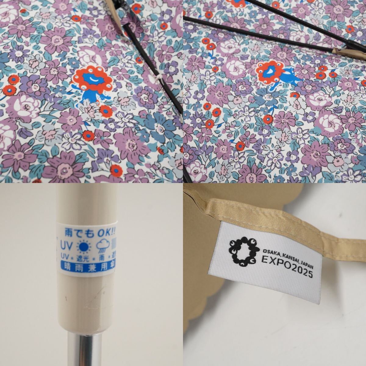 日傘 EXPO2025 関西大阪万博 ミャクミャク USED美品 晴雨兼用 フラワー リバティ キャラクター 記念グッズ ベージュ UV 遮光 遮熱 X3662