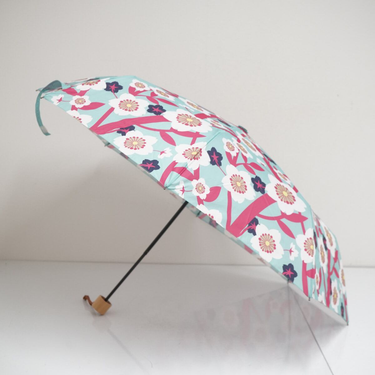折りたたみ傘 HOKUSAI GRAPHIC 北斎グラフィック USED美品 三つ折り畳み傘 晴雨兼用 晴桜 グリーン FA9415