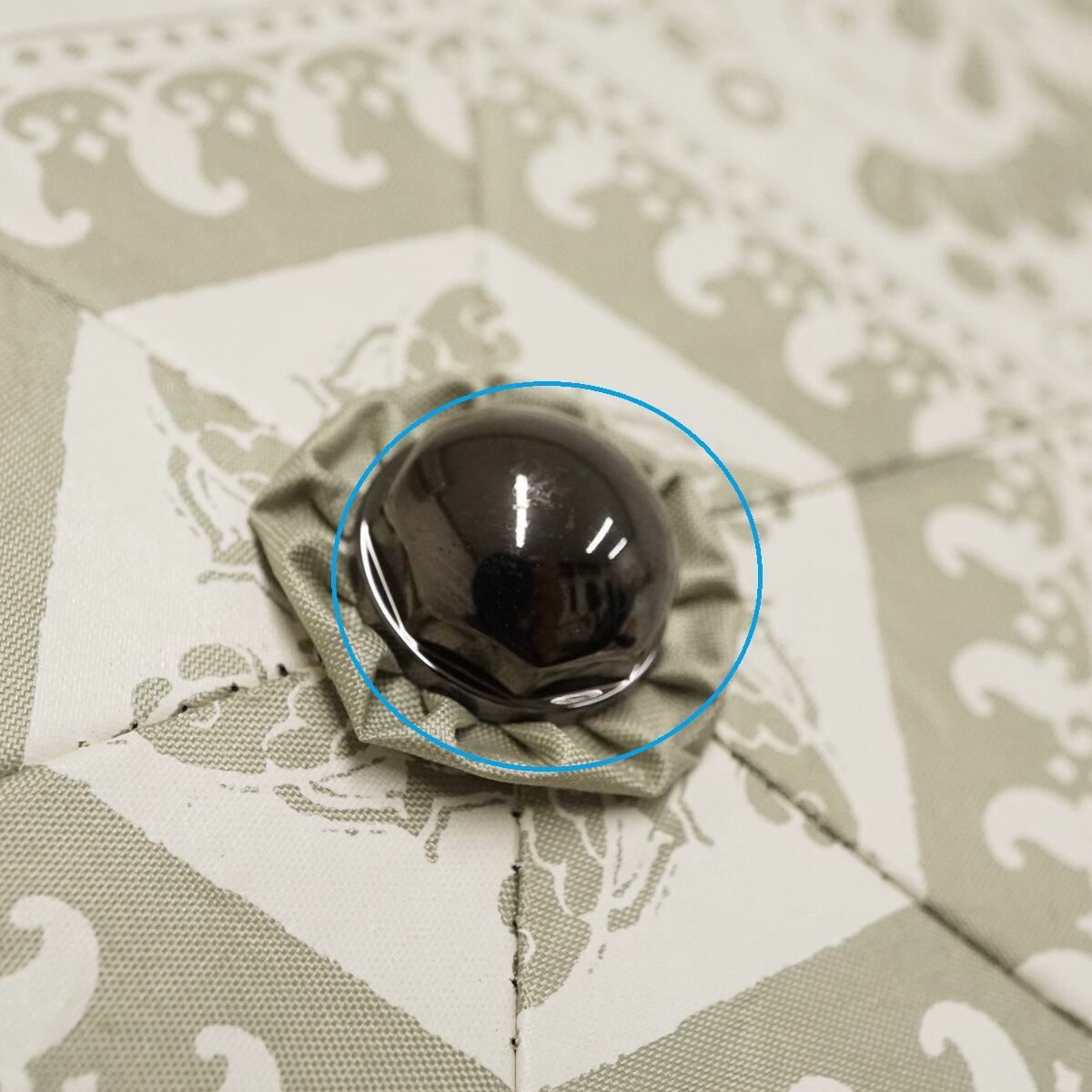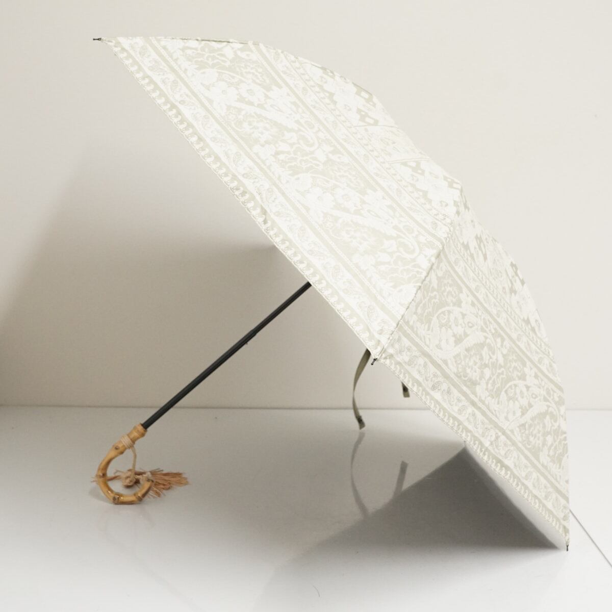 ライトグリーンにインド更紗柄の生地にバンブーハンドルとタッセルが、高級感を感じる仕上がりです。
