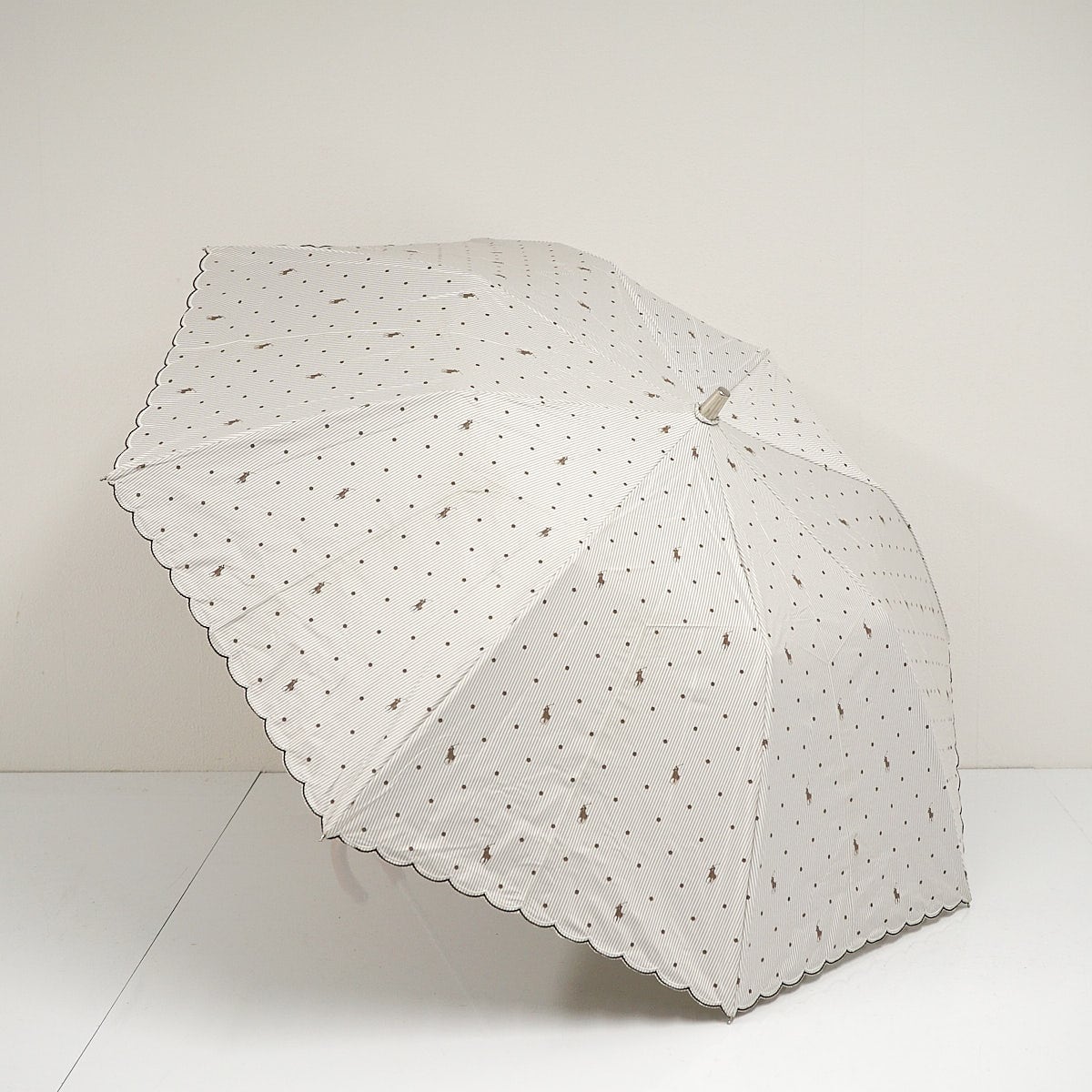 折りたたみ日傘 POLO RALPH LAUREN ポロラルフローレン USED美品 晴雨兼用 ストライプドット ポロポニー スカラップ ベージュ 55cm FS9544