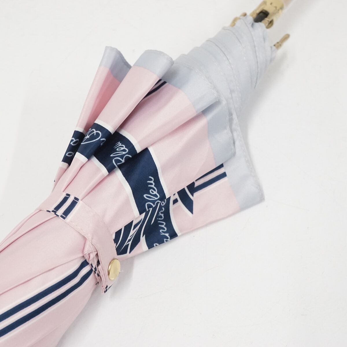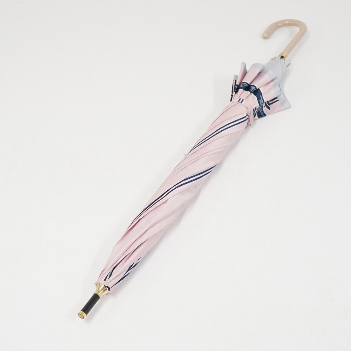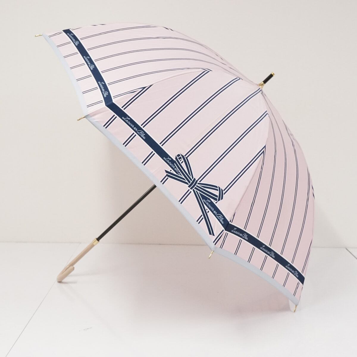 ライトピンクの生地にストライプやリボンのデザインが入ったアンブレラです。