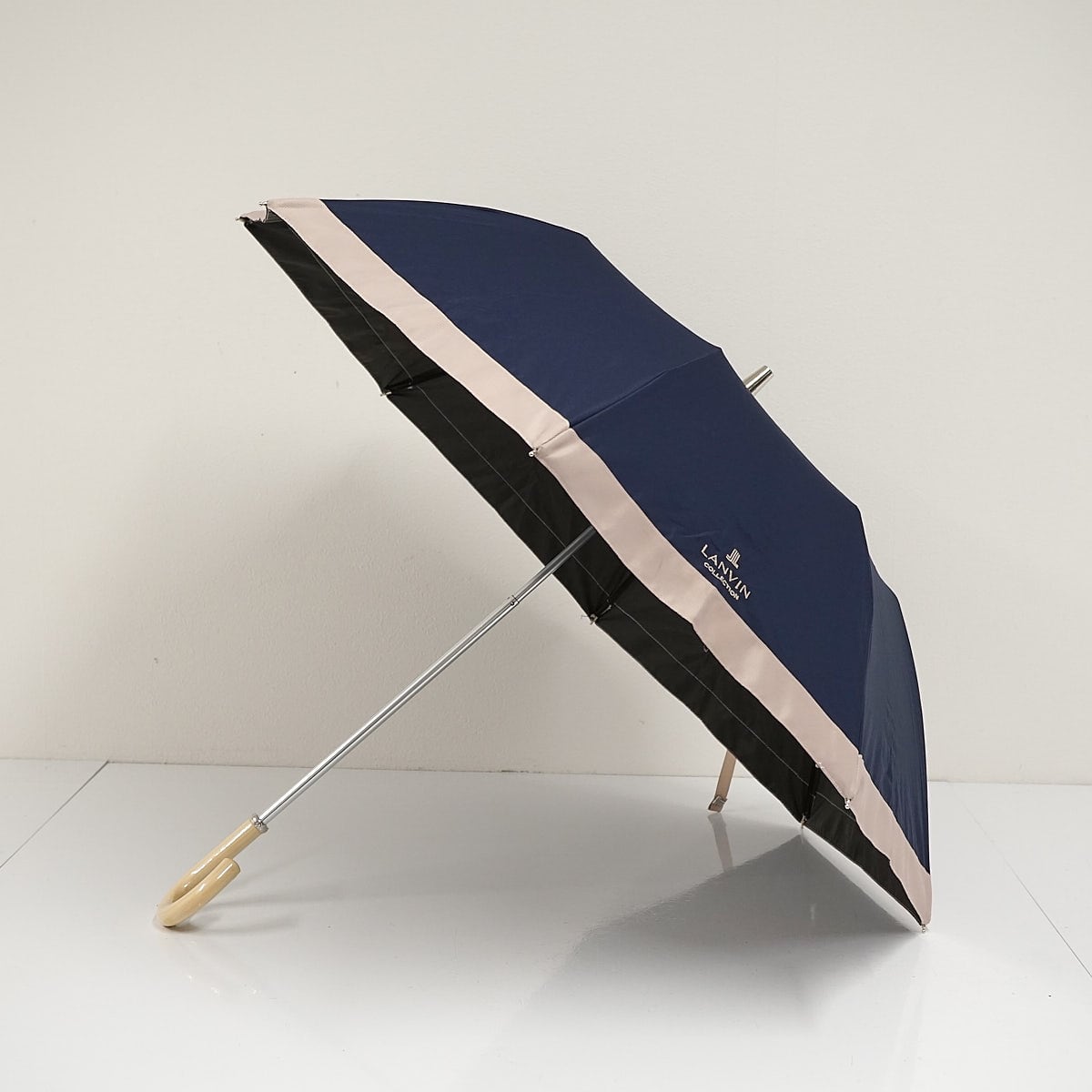 折りたたみ日傘 LANVIN COLLECTION ランバンコレクション USED品 晴雨兼用 ディープブルー グログランリボン ロゴ刺繍 UV FA9545