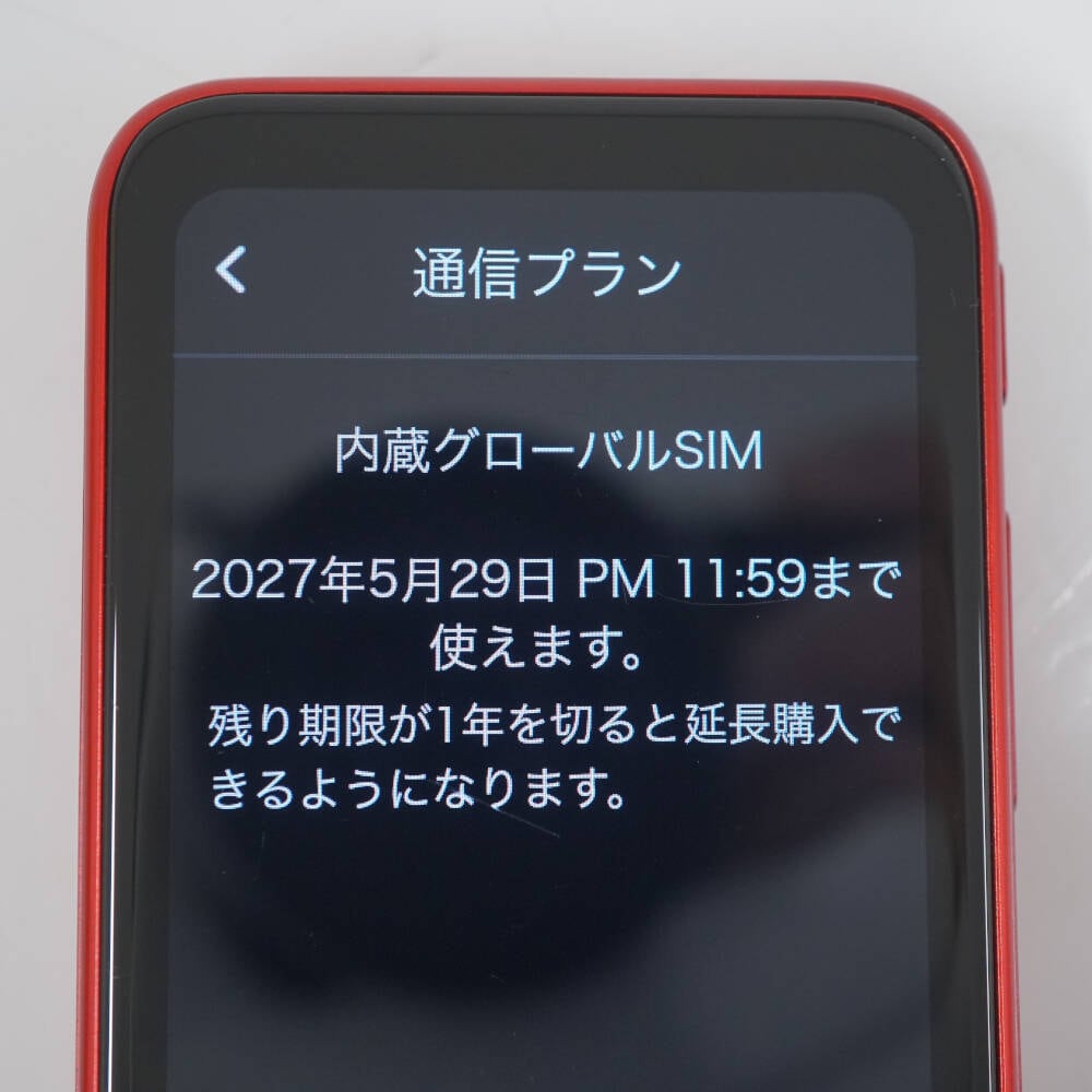 ※内蔵SIMによるグローバル通信期限は、「2027年5月29日 PM 11:59」です(残り期限が1年を切ると延長購入できるようになります)。