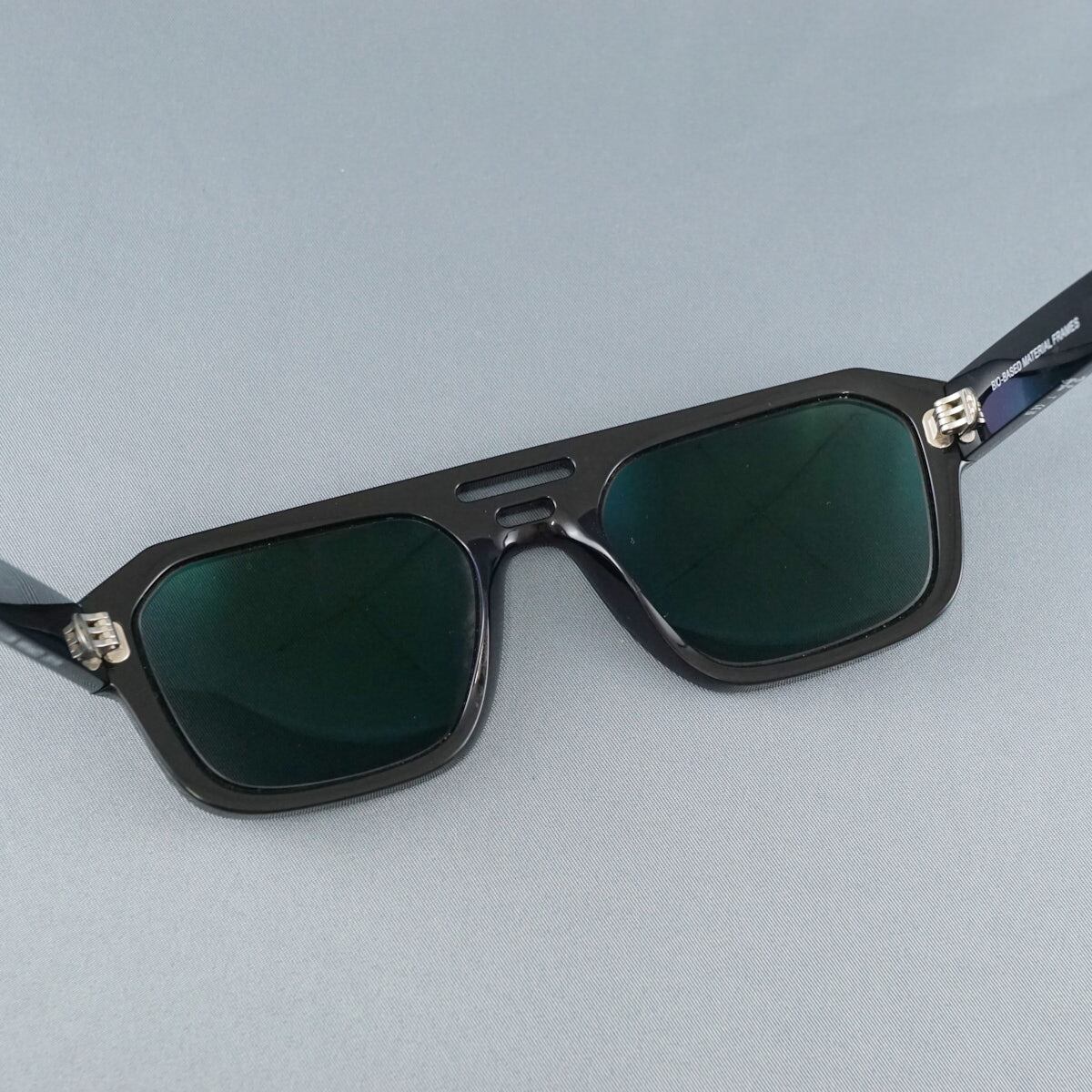 バイオベース炭素含有量67%のバイオアセテートを使用したスタイリッシュなこのモデルは、ブラックのテンプルにクラシックなグリーンレンズを組み合わせています。