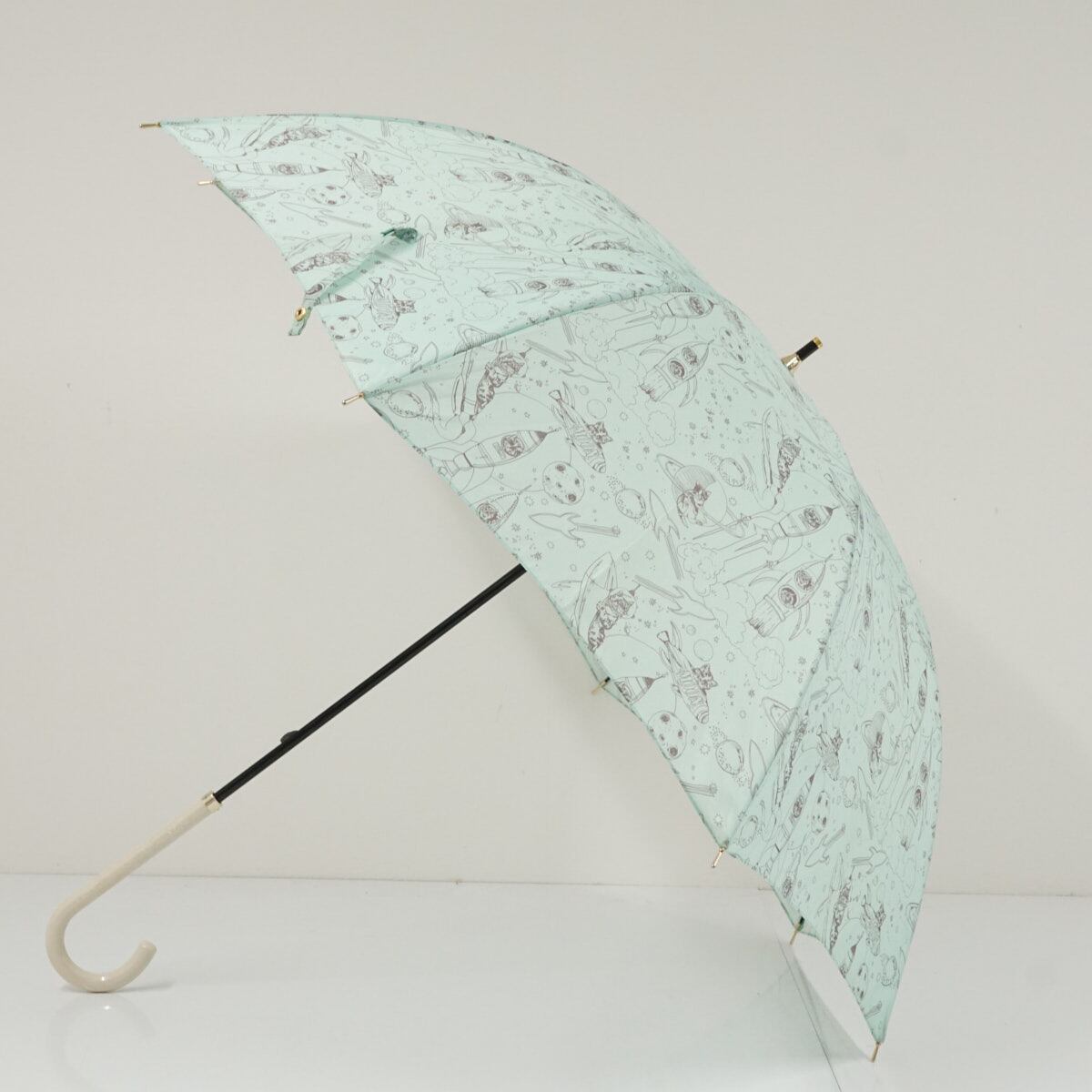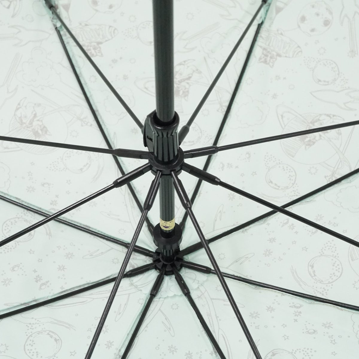 宇宙飛行士になった猫がロケットに乗って宇宙散策をしている、ちょっぴり個性的なデザインの長傘です。