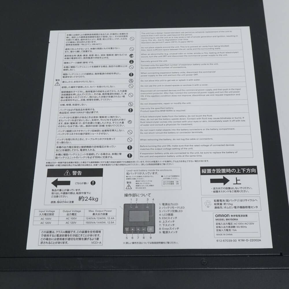 OMRON BN150RA 無停電電源装置 USED品 UPS オムロン 出力容量:1240VA 1240W 完動品 EX0032