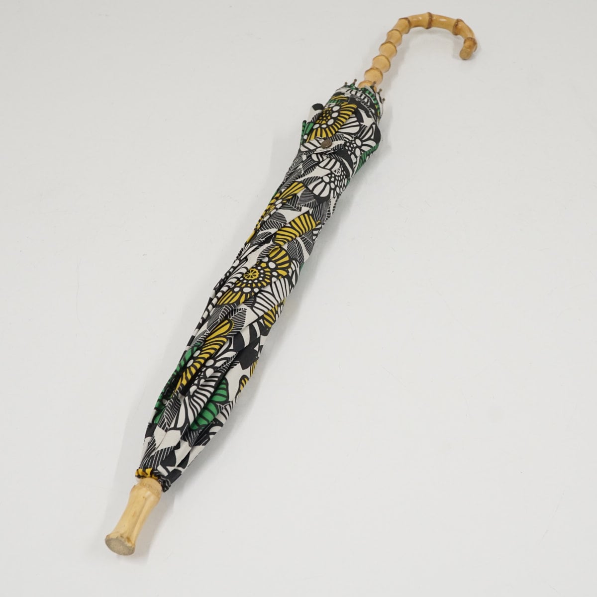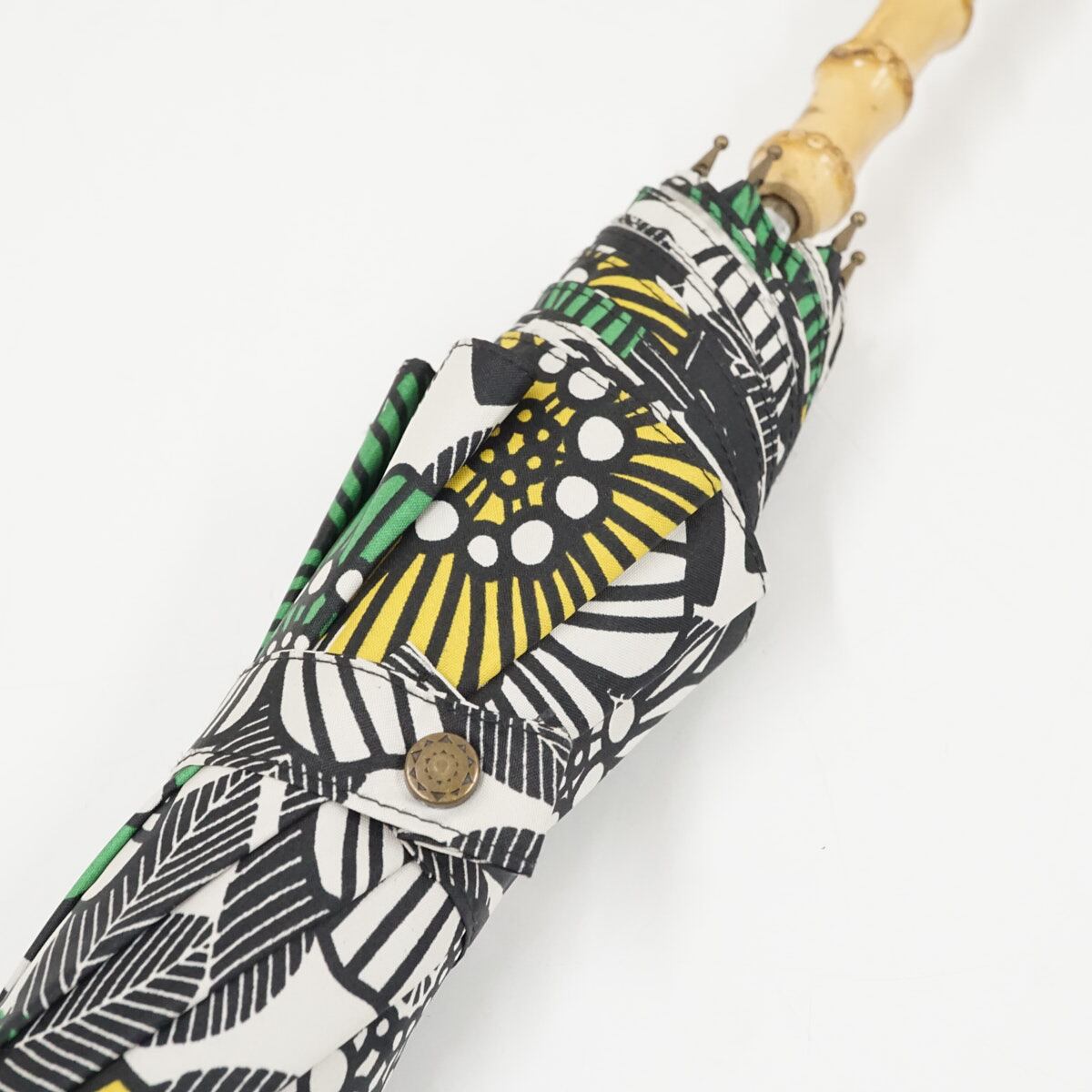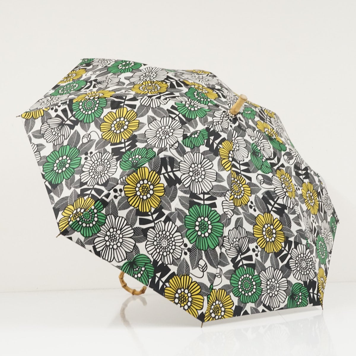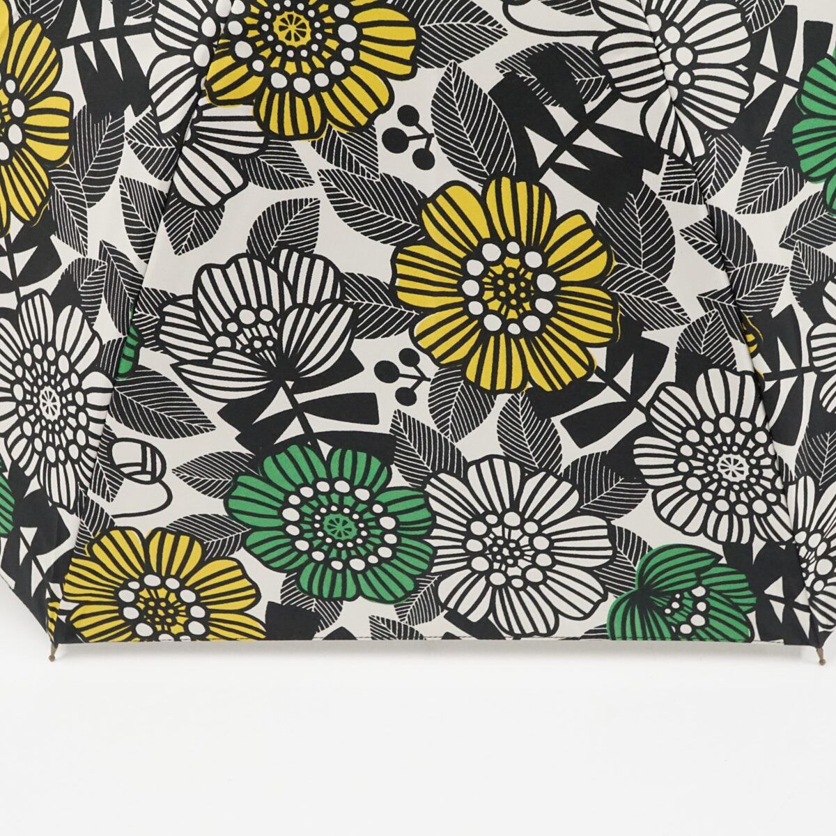 ホワイトの生地に、グリーンやイエローのフラワーが描かれたデザインです。