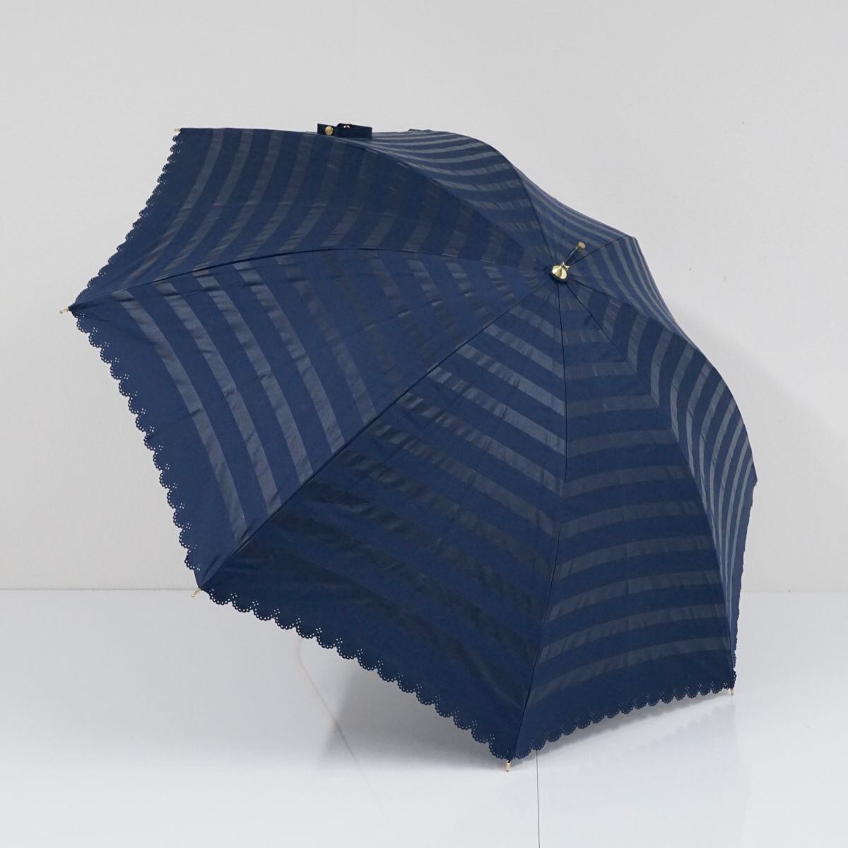 ボーダーが入ったネイビーの生地に外周をフラワーレース加工で囲んだ