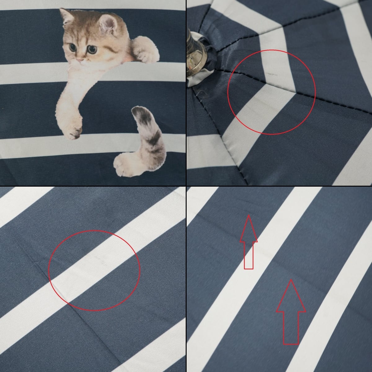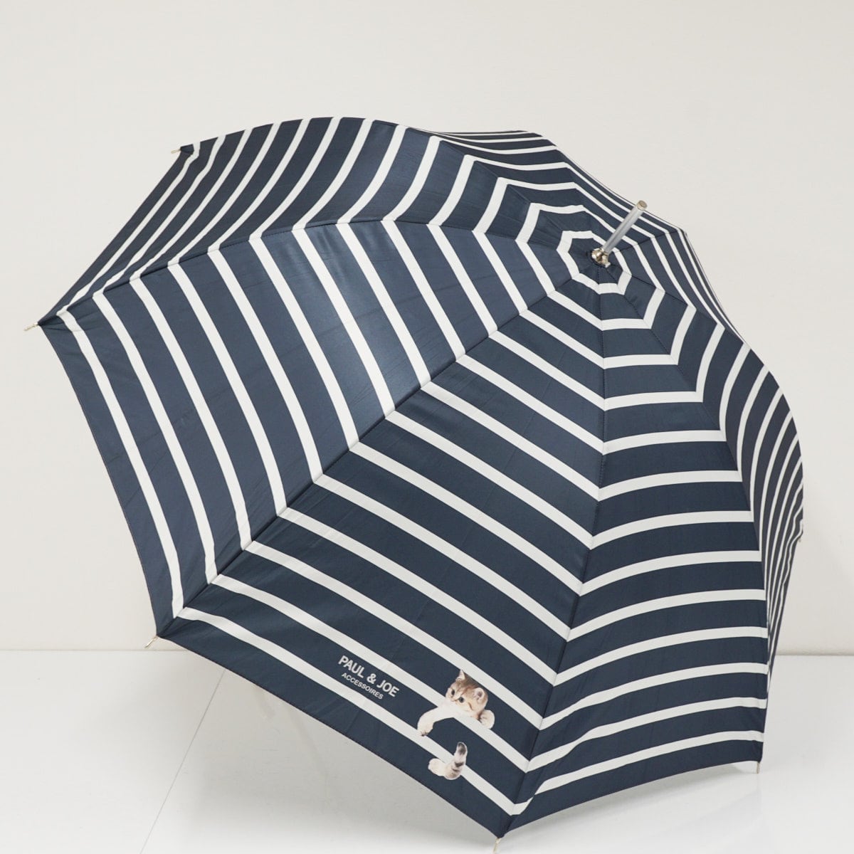 「ポール&ジョー」の人気のアイコン猫「ヌネット」がストライプ柄にぶら下がっている、可愛らしいデザインのアンブレラです。