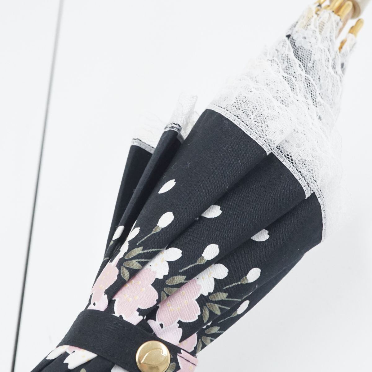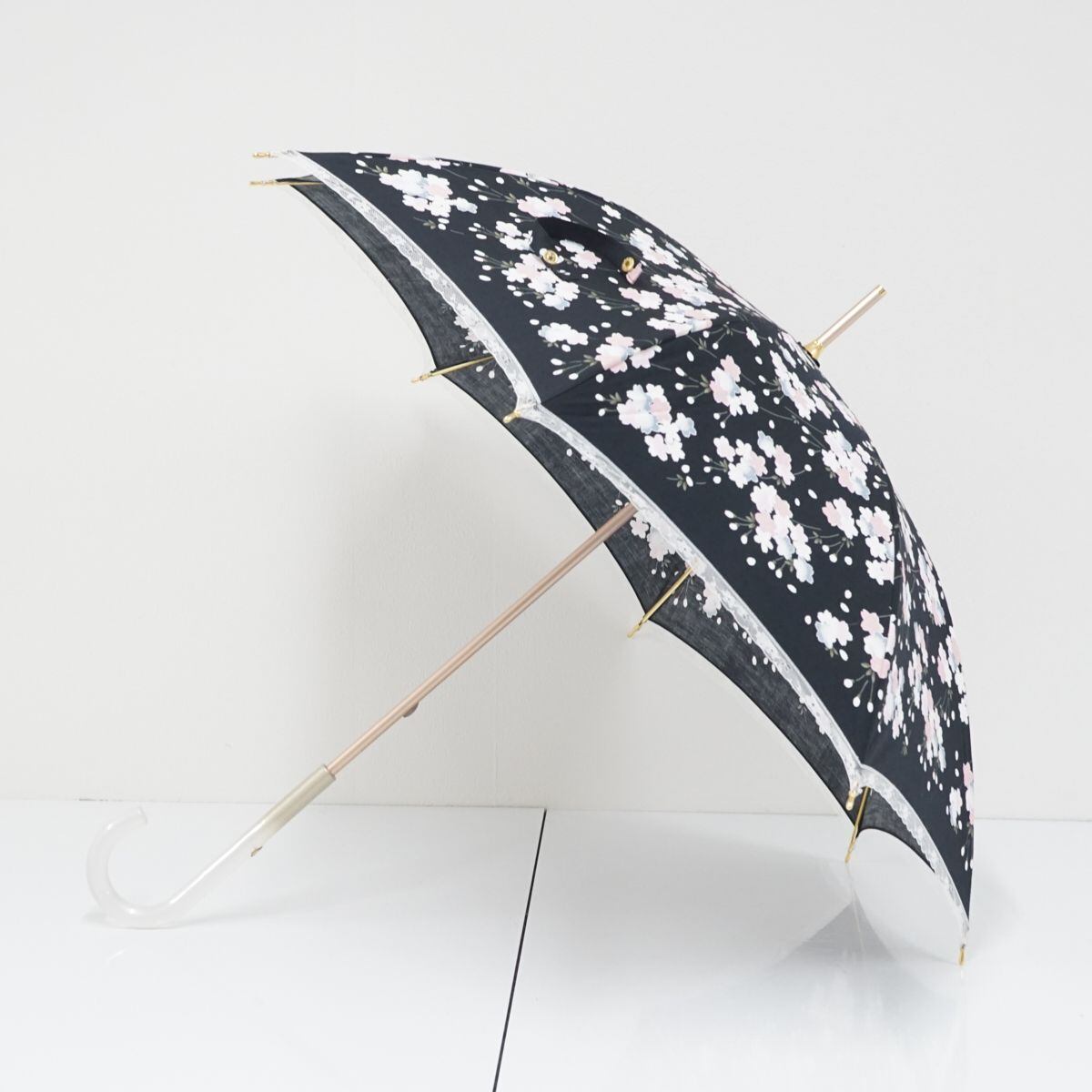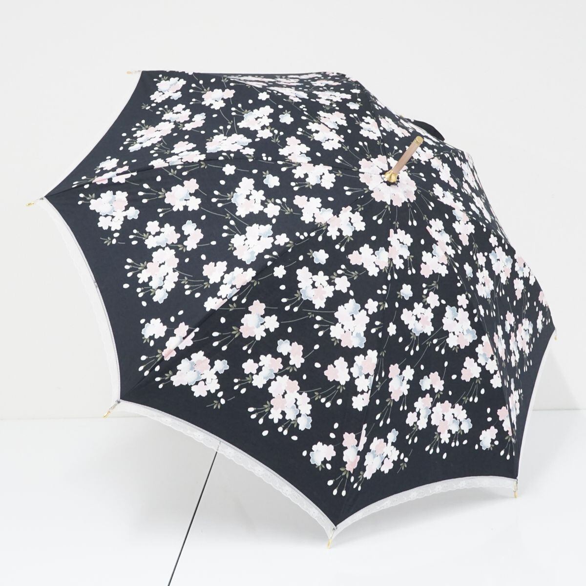 宇野千代 USED超美品 晴雨兼用日傘 ブラック 桜 和風 レース クリア手元 ロゴ 刺繍 フリル 50cm T A9641
