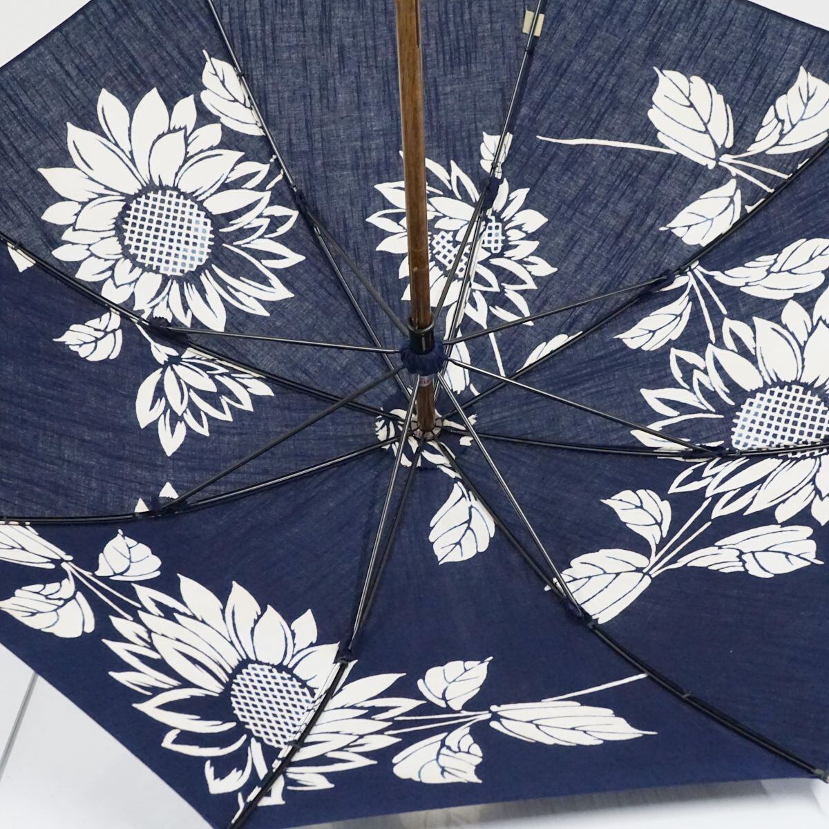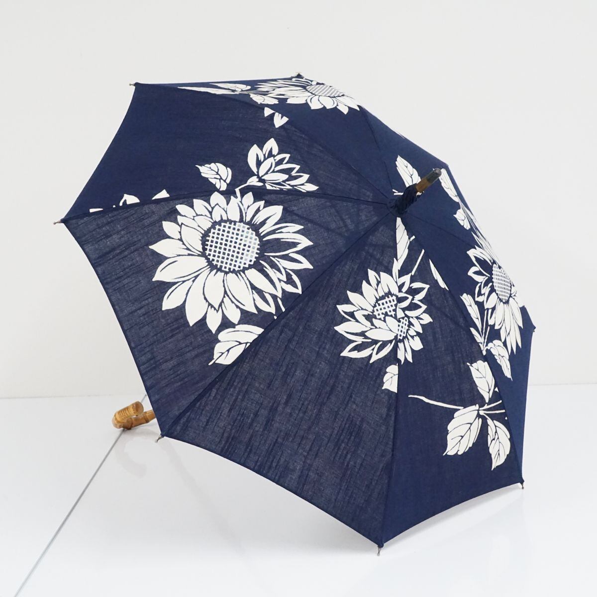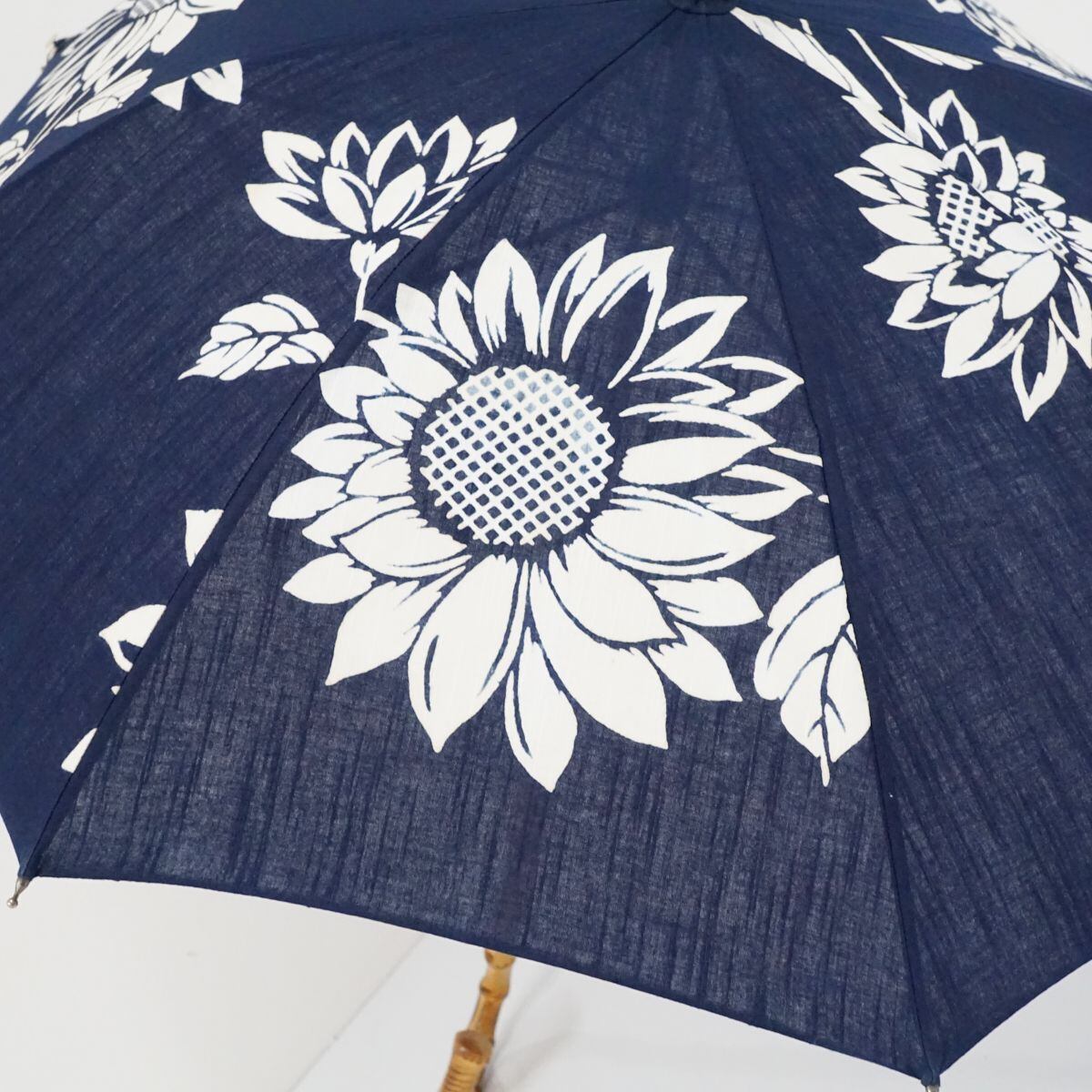 日傘 WAKAO ワカオ USED品 ネイビー ひまわり 花 ブルー バンブー 40cm KR S9729