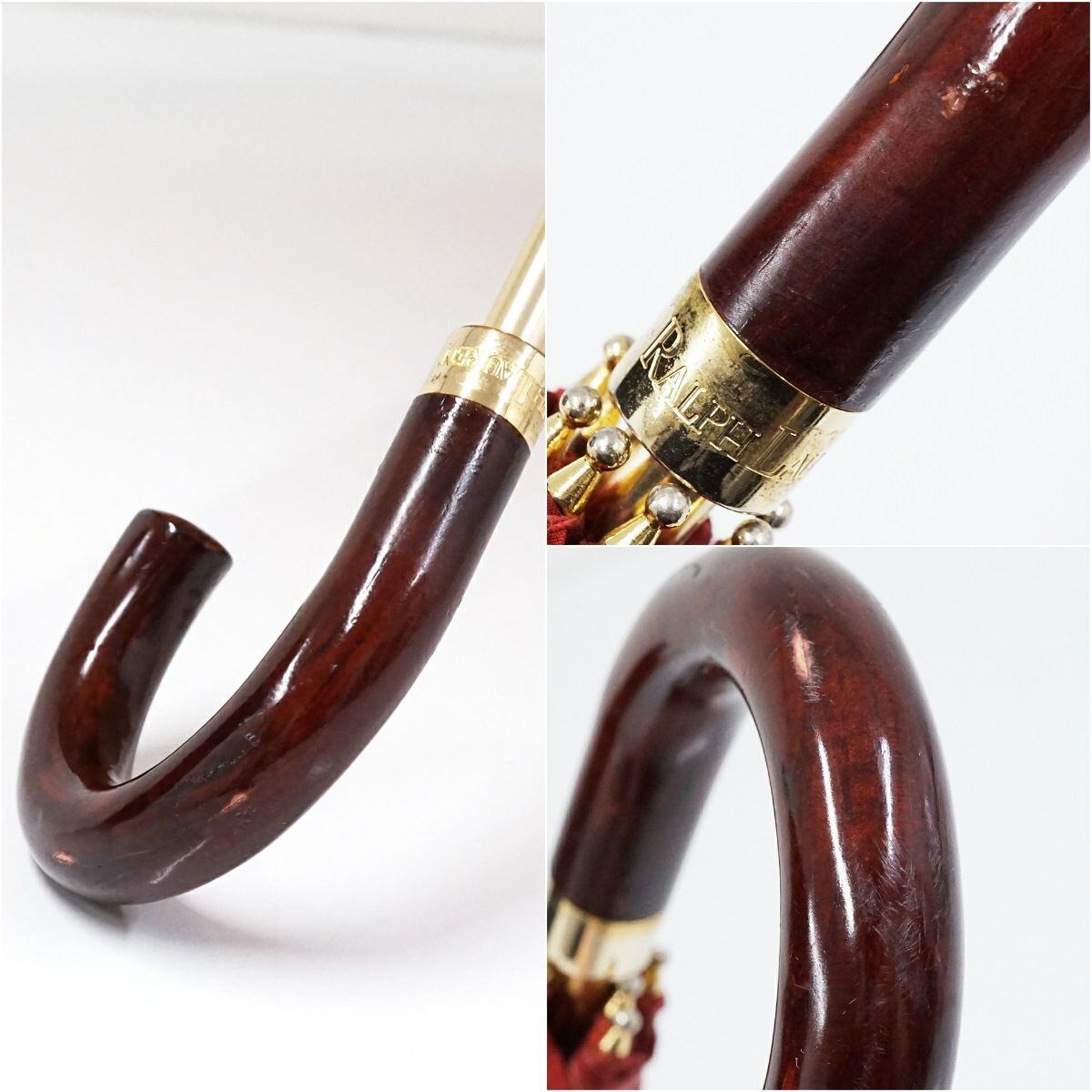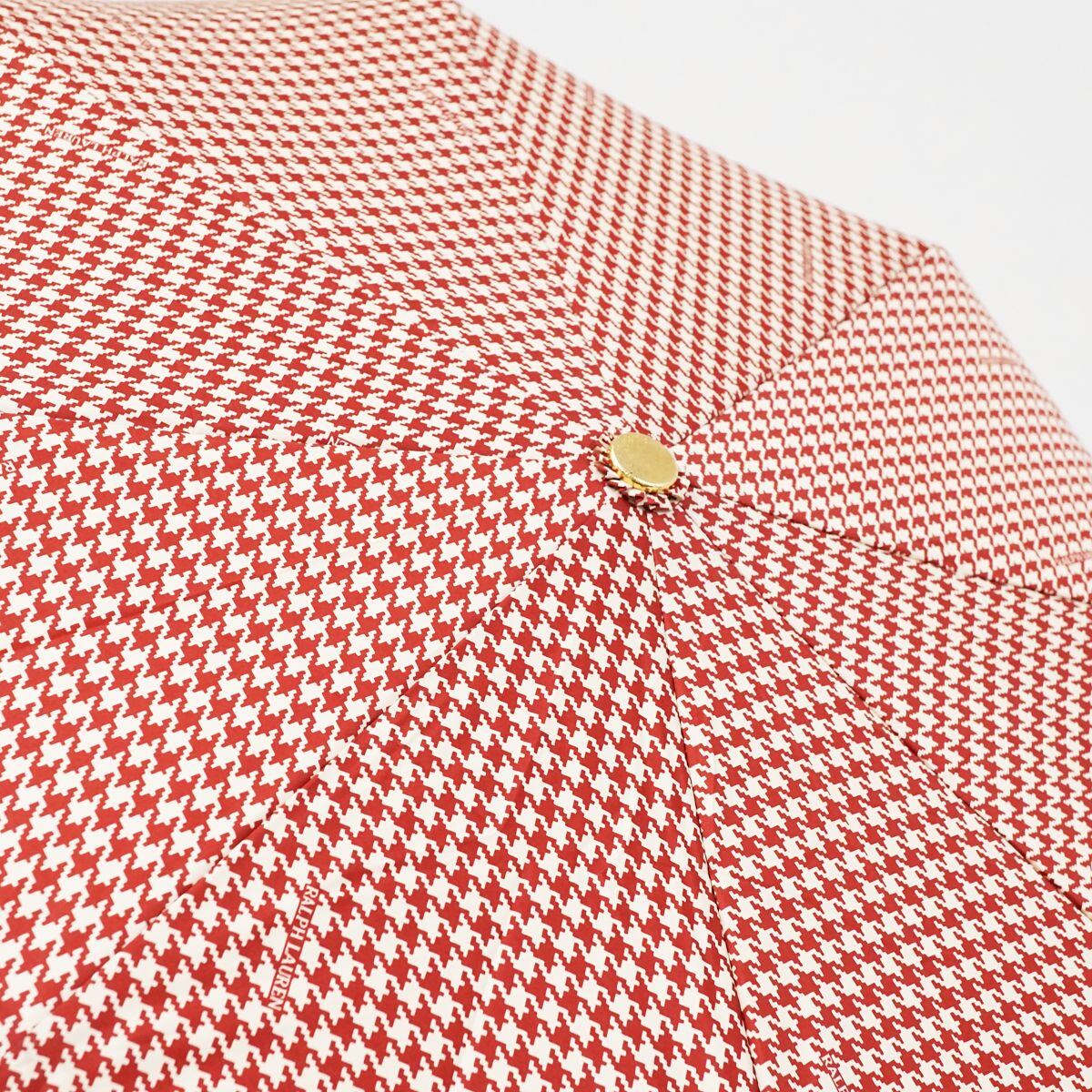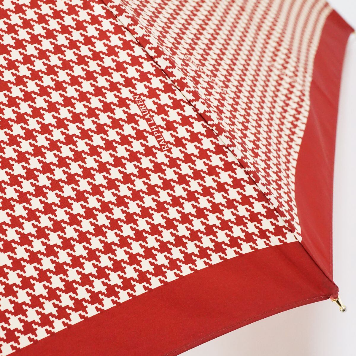 折りたたみ傘 RALPH LAUREN ラルフローレン USED美品 ダークレッドxベージュ 千鳥格子 ロゴ 木製手元 58cm S FS8105