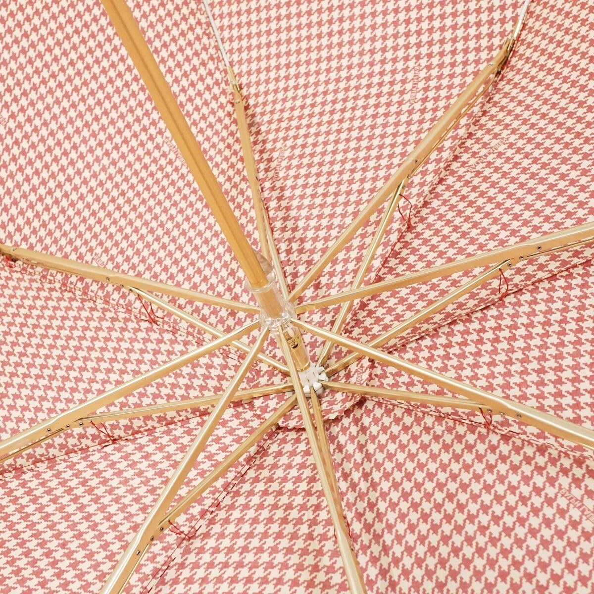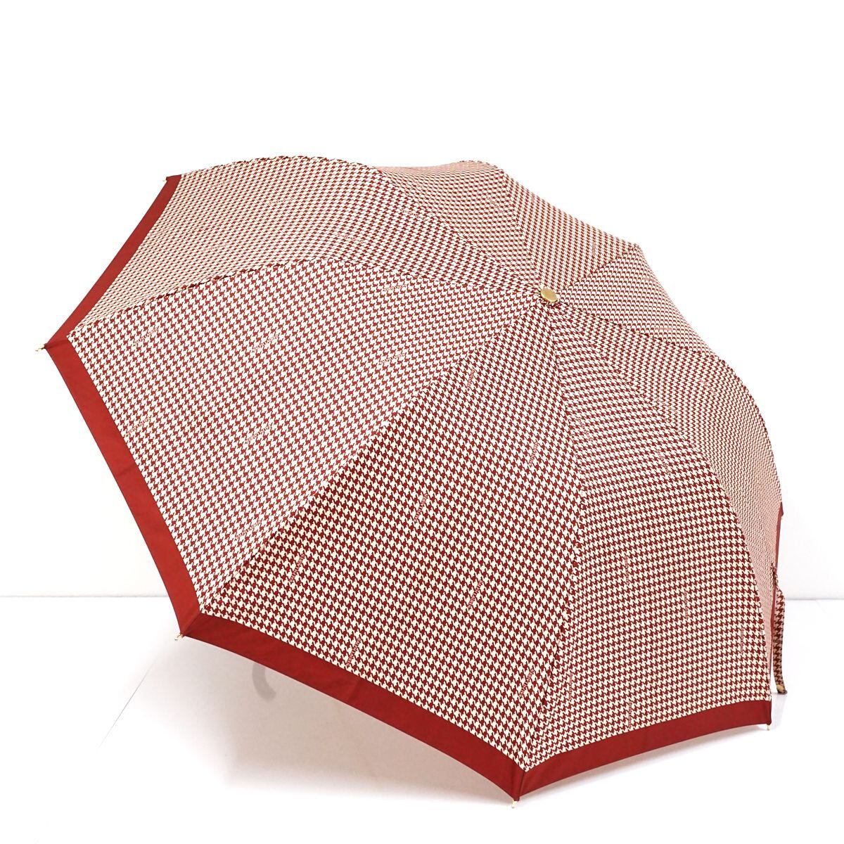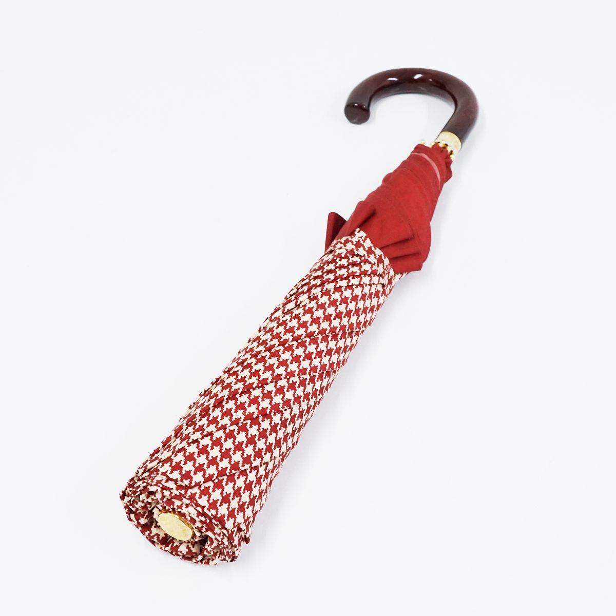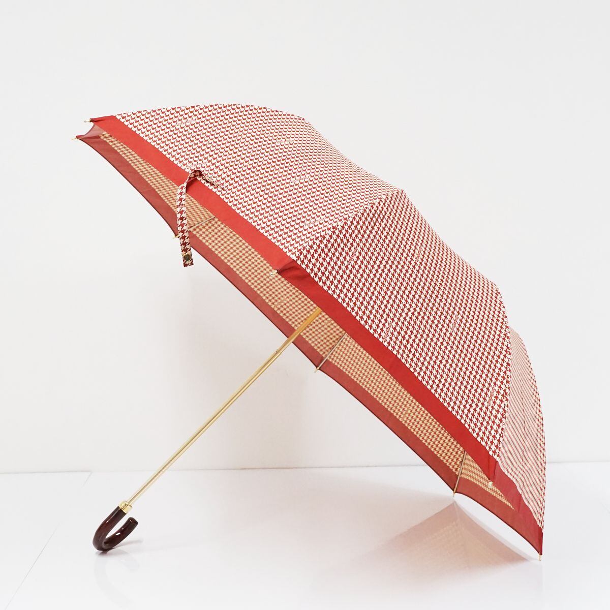 折りたたみ傘 RALPH LAUREN ラルフローレン USED美品 ダークレッドxベージュ 千鳥格子 ロゴ 木製手元 58cm S FS8105