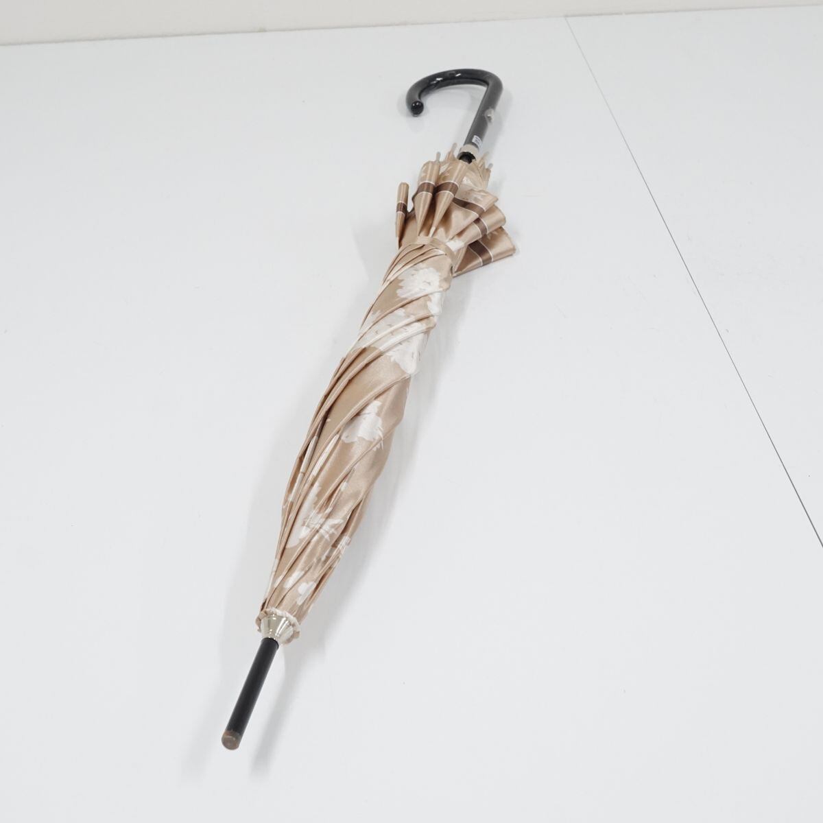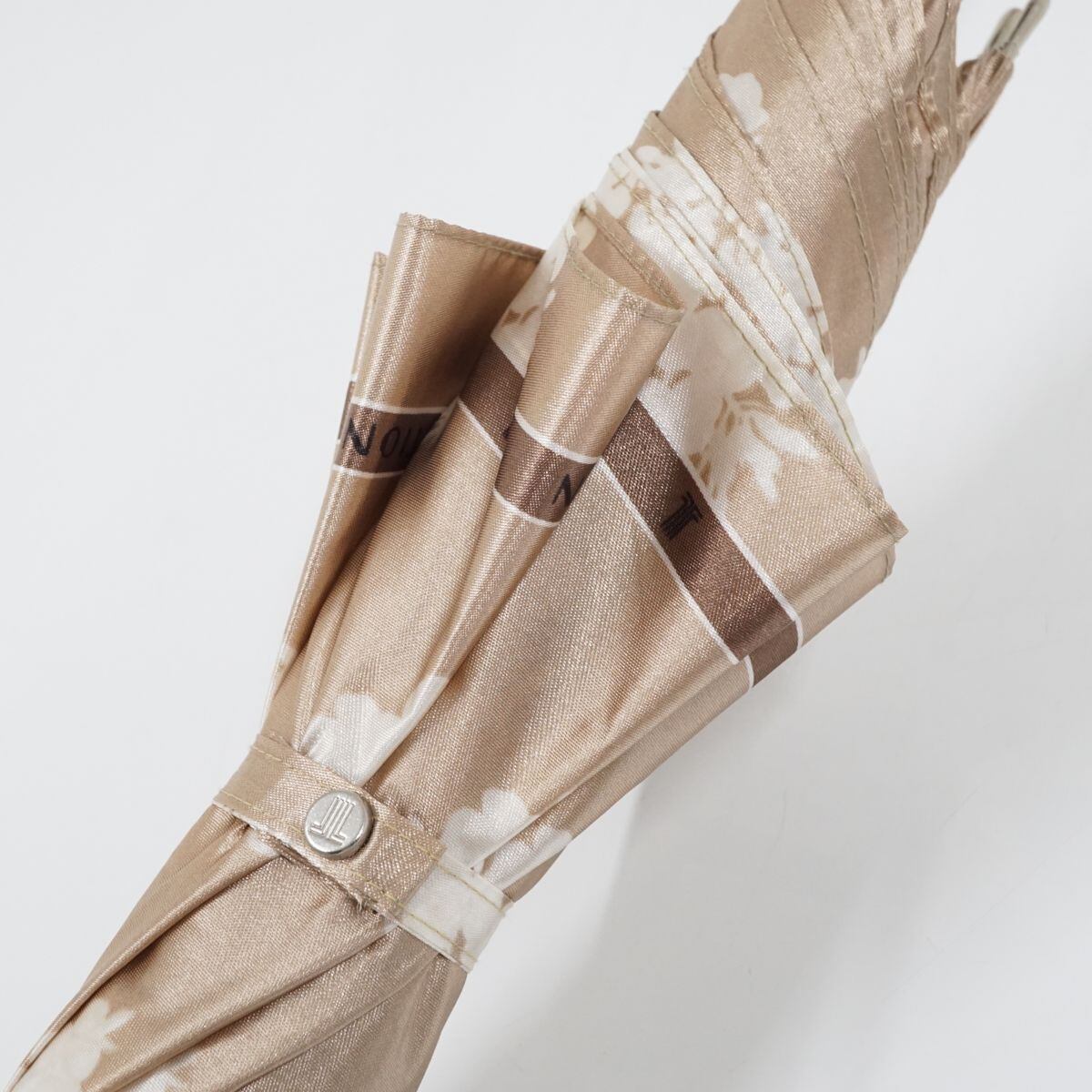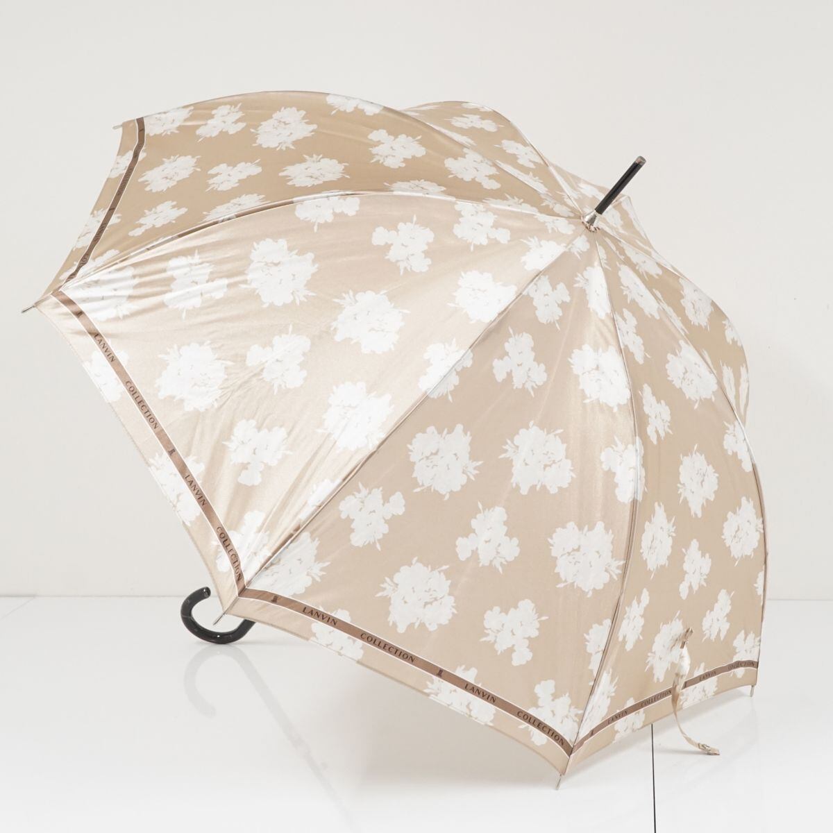 光沢のあるベージュの生地に、フラワーをデザインした「ランバンコレクション」の傘です。