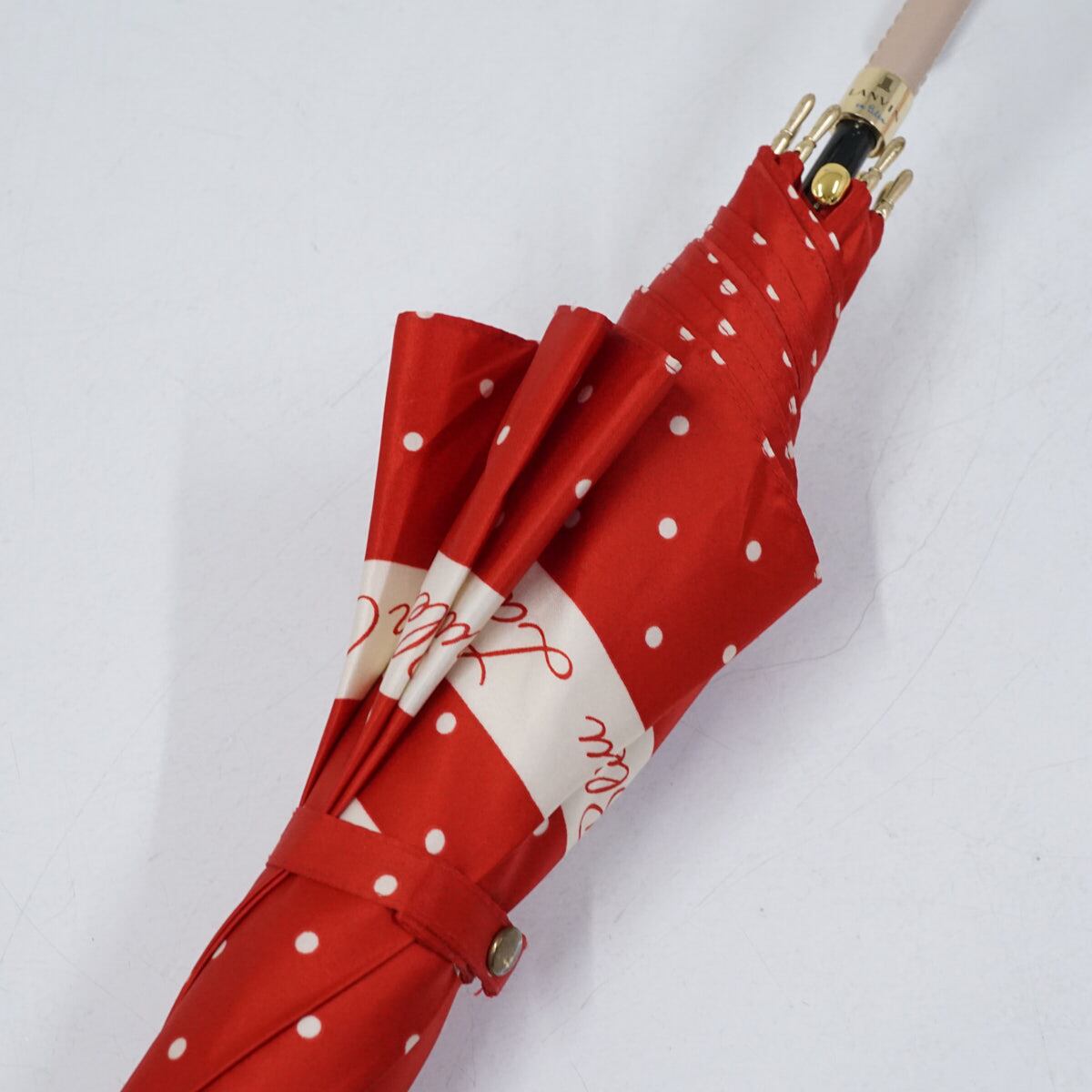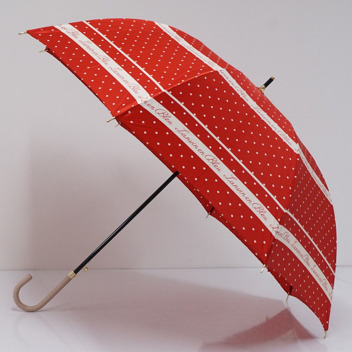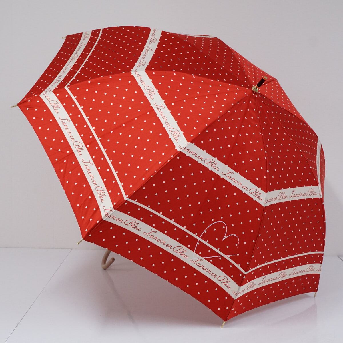 レッド×アイボリーのドットパターンをベースに、ロゴ入りのボーダーラインと手書き風のハートでアクセントをきかせたランバンオンブルーのアンブレラです。