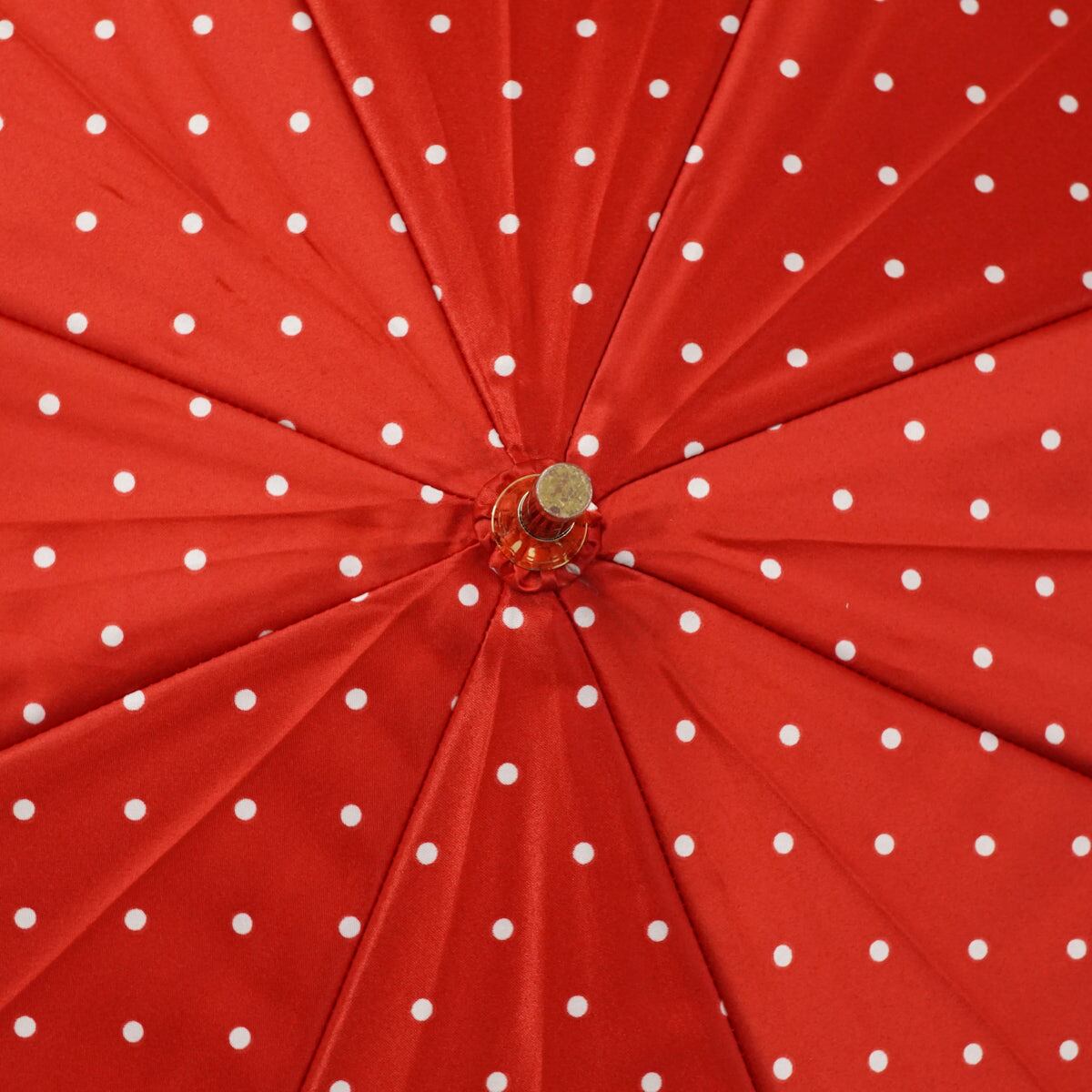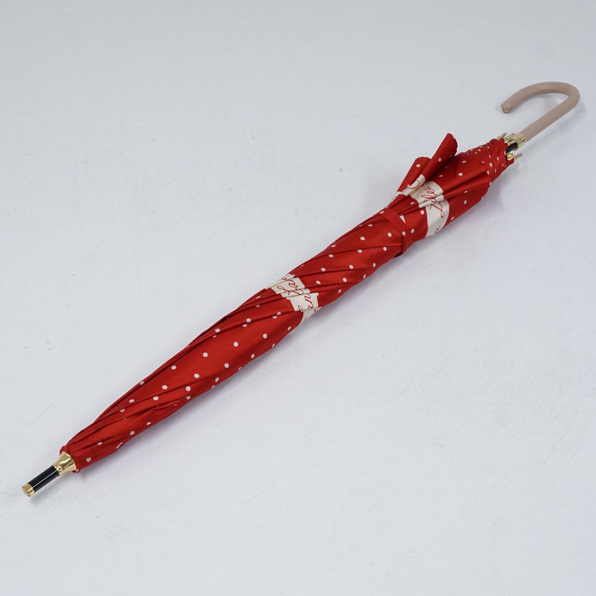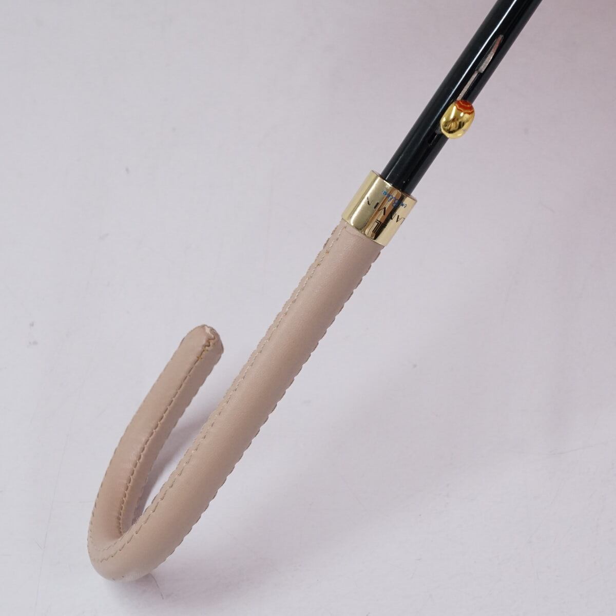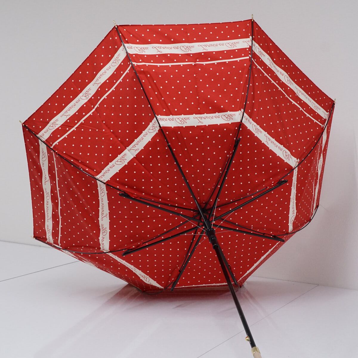 レッド×アイボリーのドットパターンをベースに、ロゴ入りのボーダーラインと手書き風のハートでアクセントをきかせたランバンオンブルーのアンブレラです。