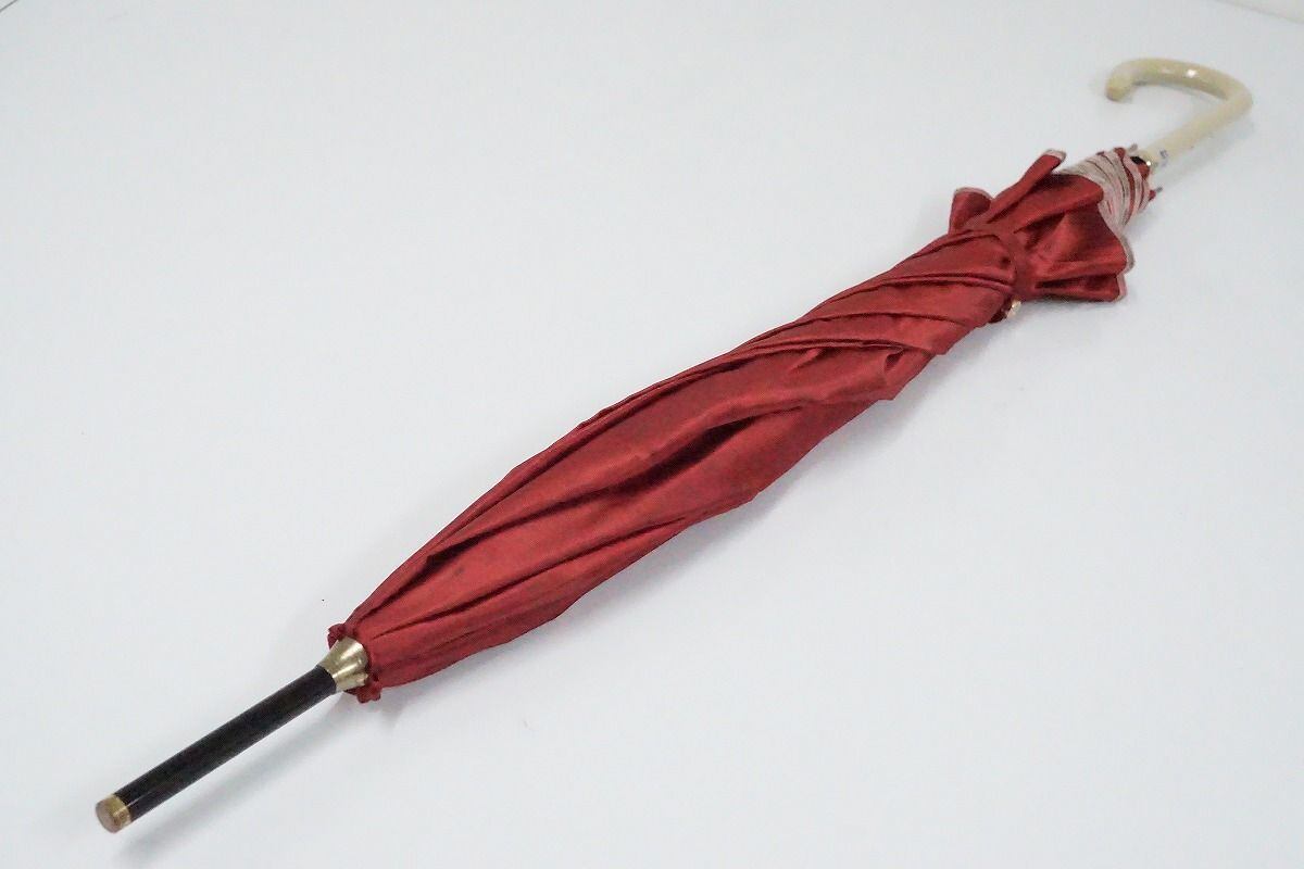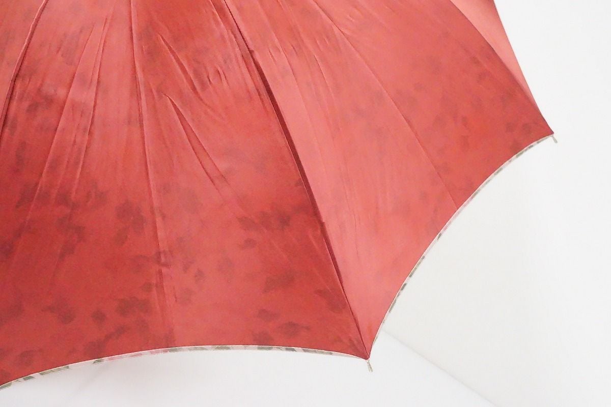 光沢のあるダークレッドの表地で、裏地にはロマンチックな花柄が咲き乱れています。