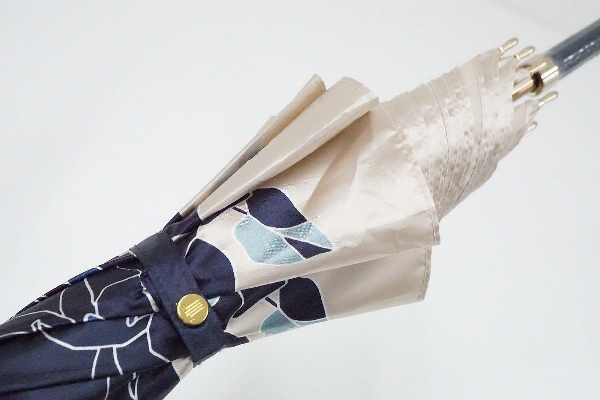 光沢のあるネイビー×ベージュ生地外周にアートフラワーを描き、全体にロゴをあしらっています。
