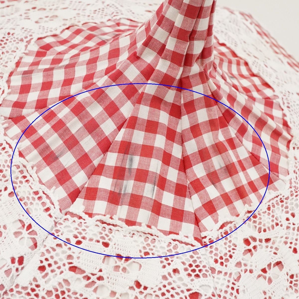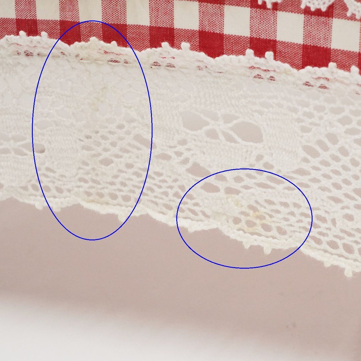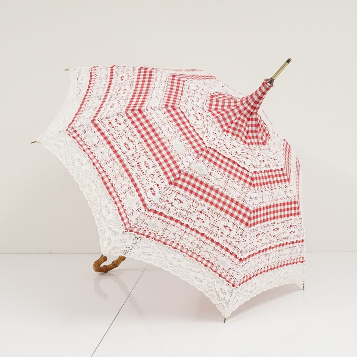 レッド×ホワイトのギンガムチェック生地に、2パターンのレースを重ねた贅沢な造りの一本です。