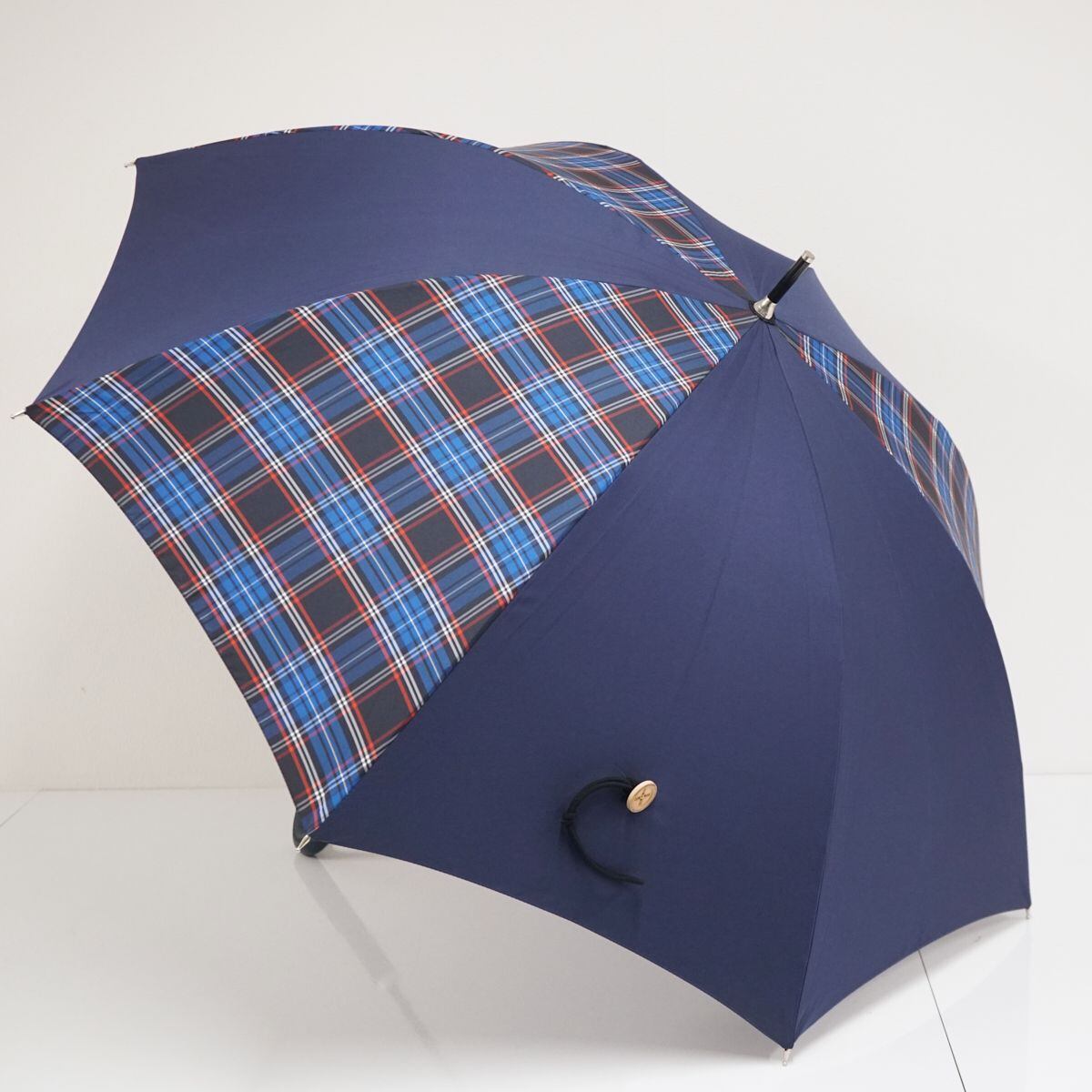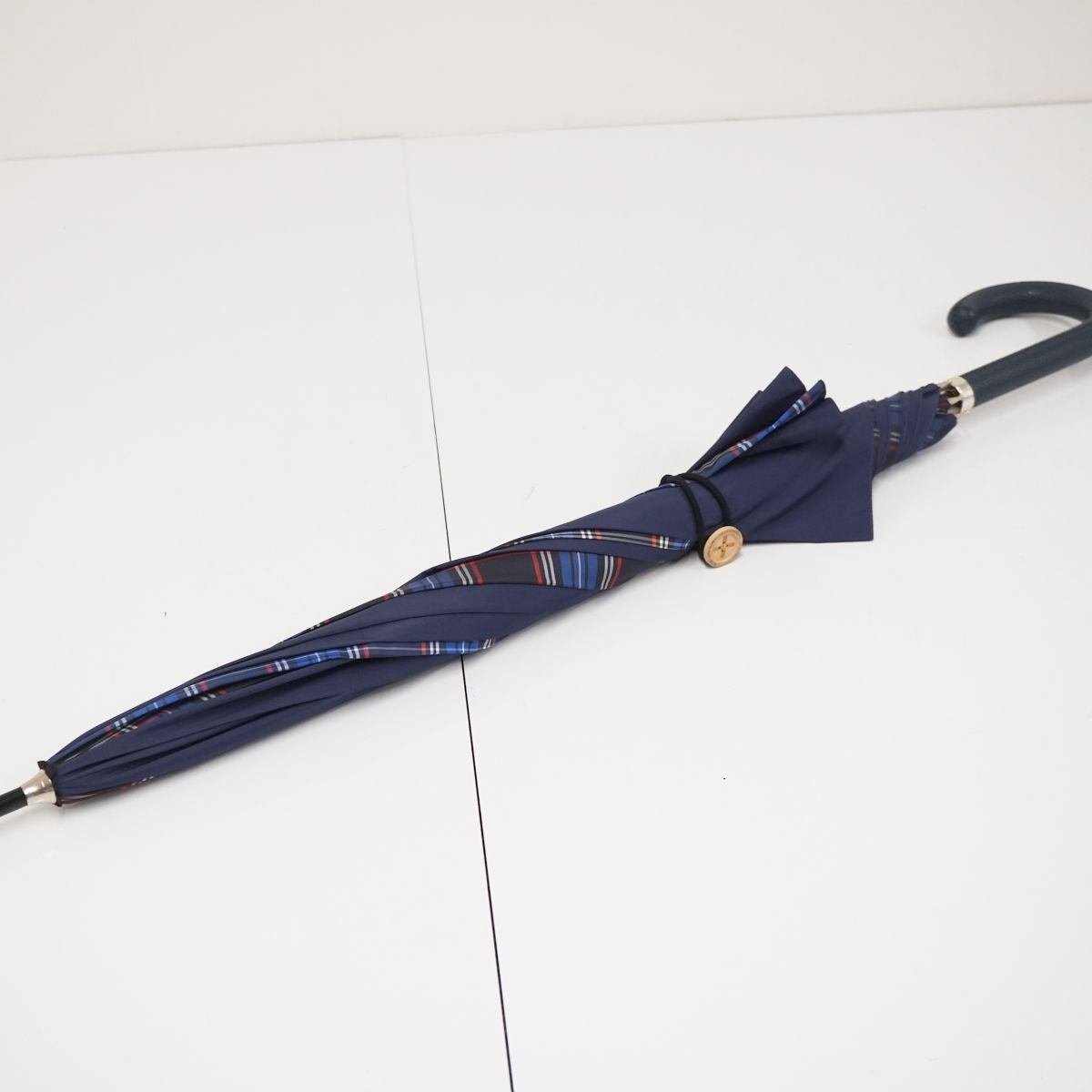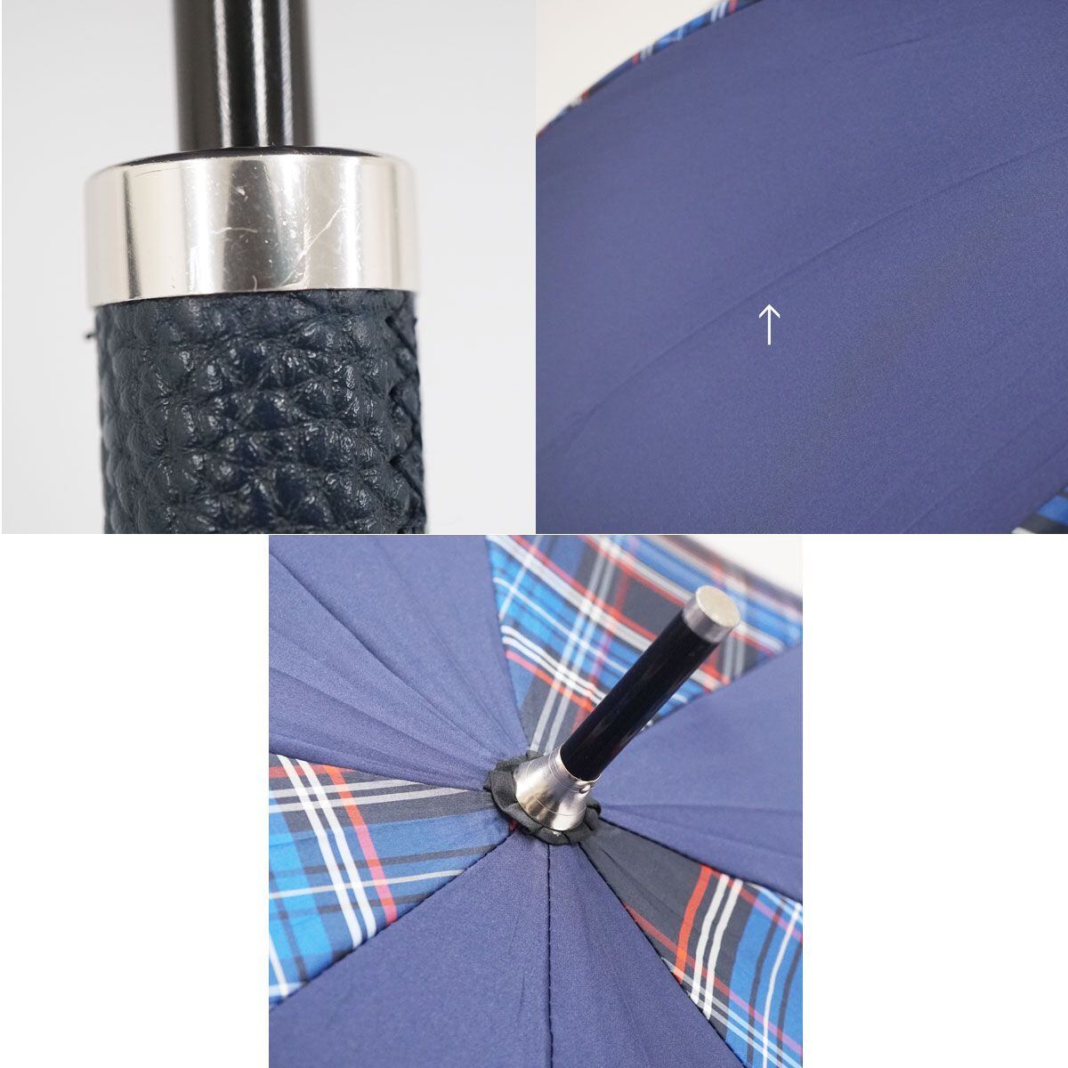 RING プラスリング 傘 USED美品 チェック×無地 ネイビー系 手元レザー カジュアル 60cm T A0321