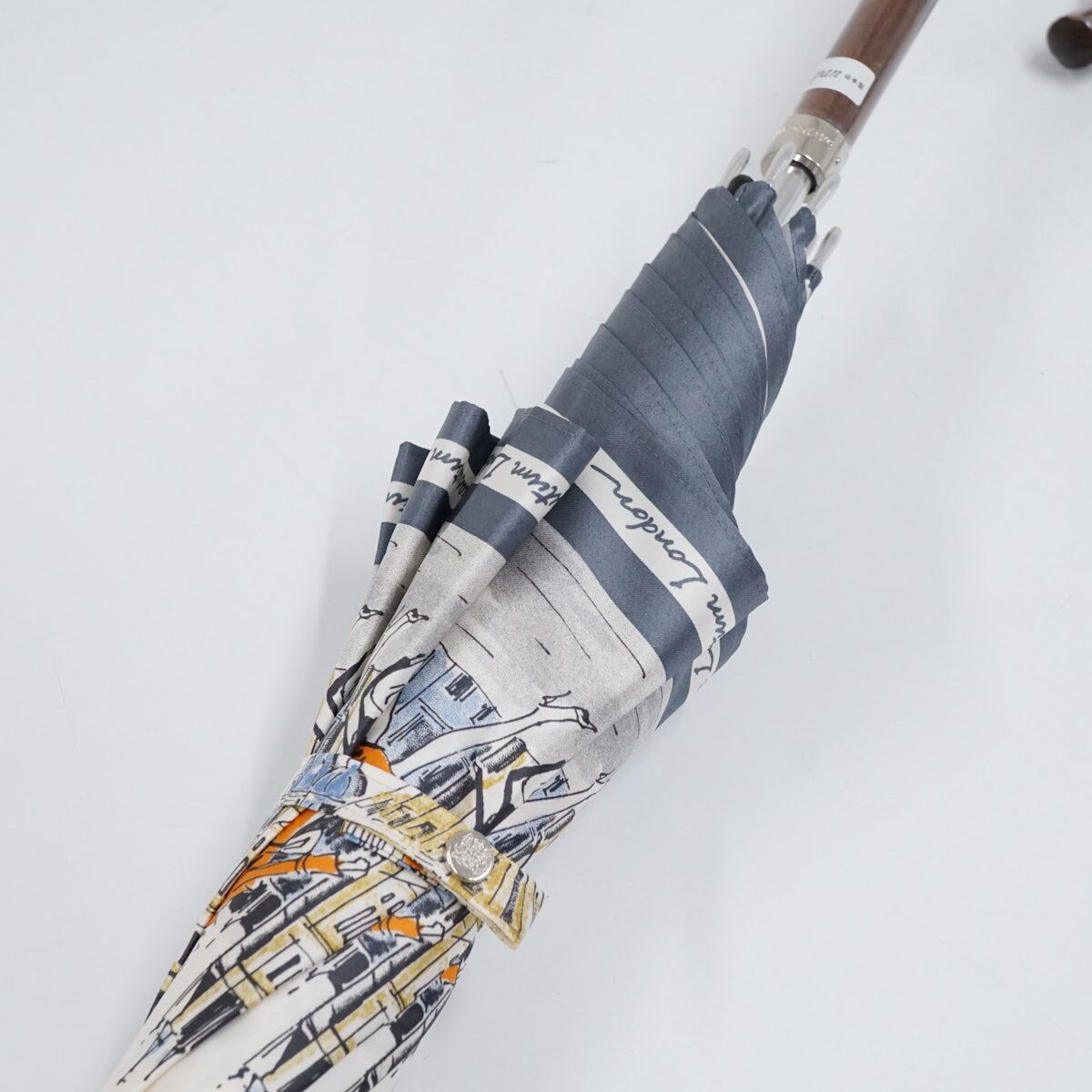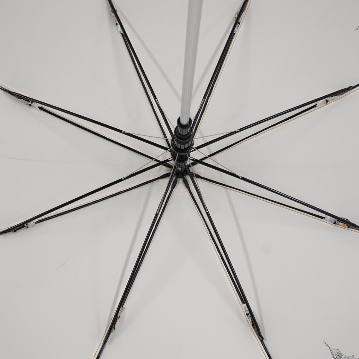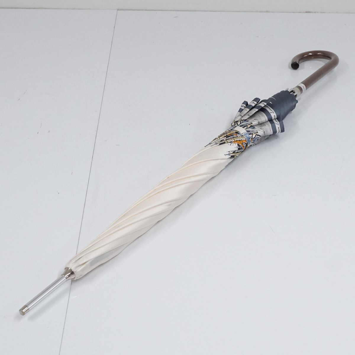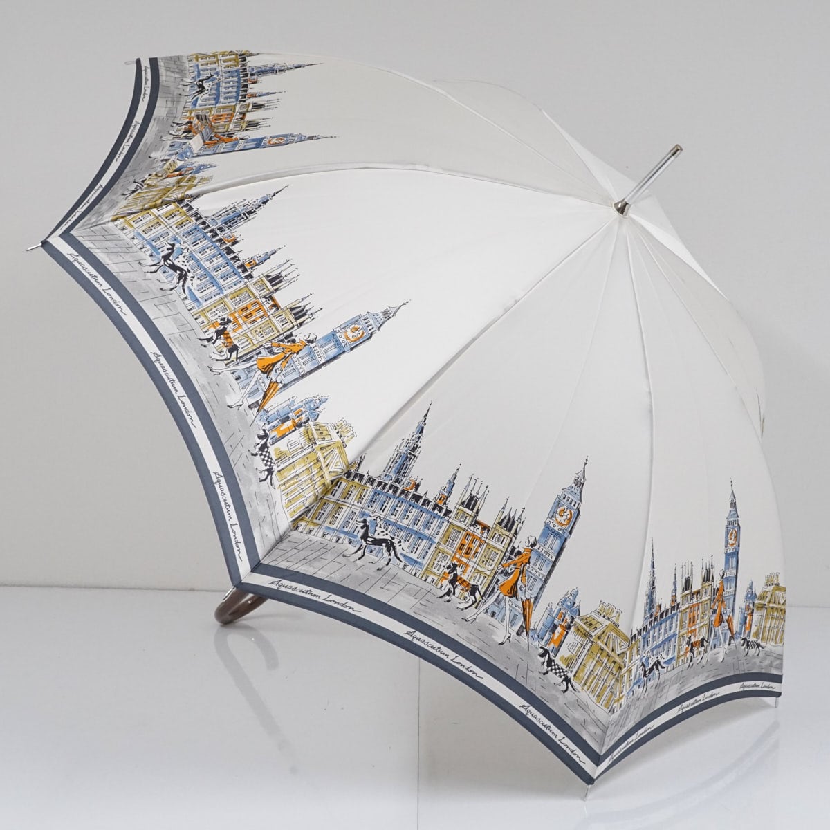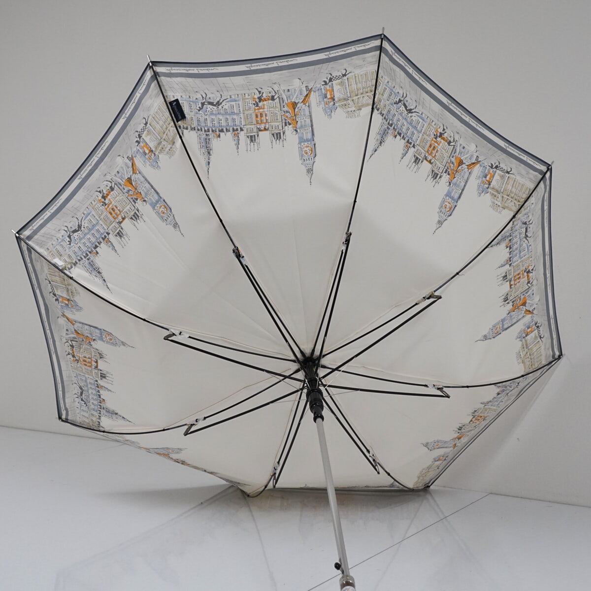 耐風傘 Aquascutum アクアスキュータム USED美品 街並み 女性 犬 アイボリー イラスト ジャンプ グラス骨 風に強い 日本製 60cm S2796