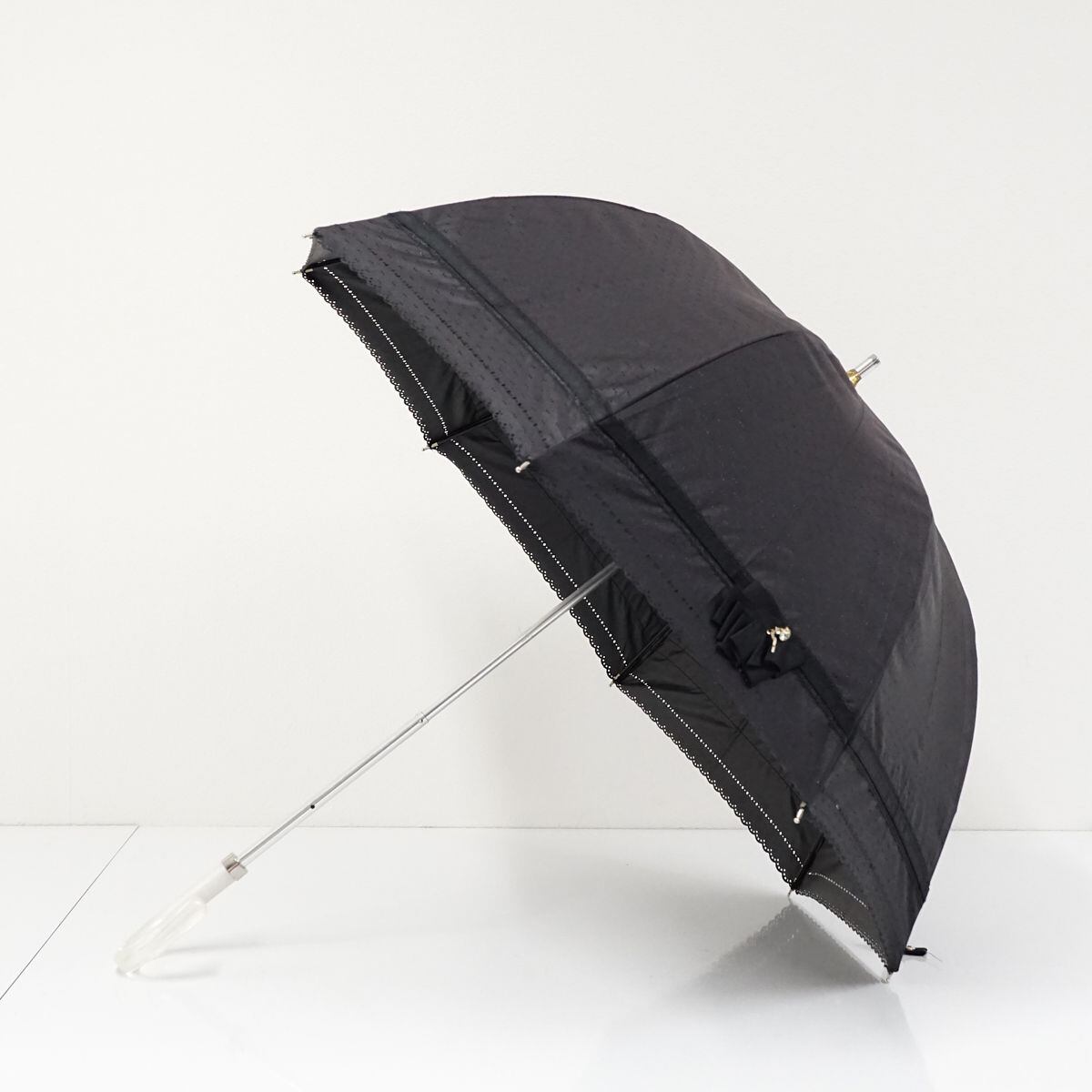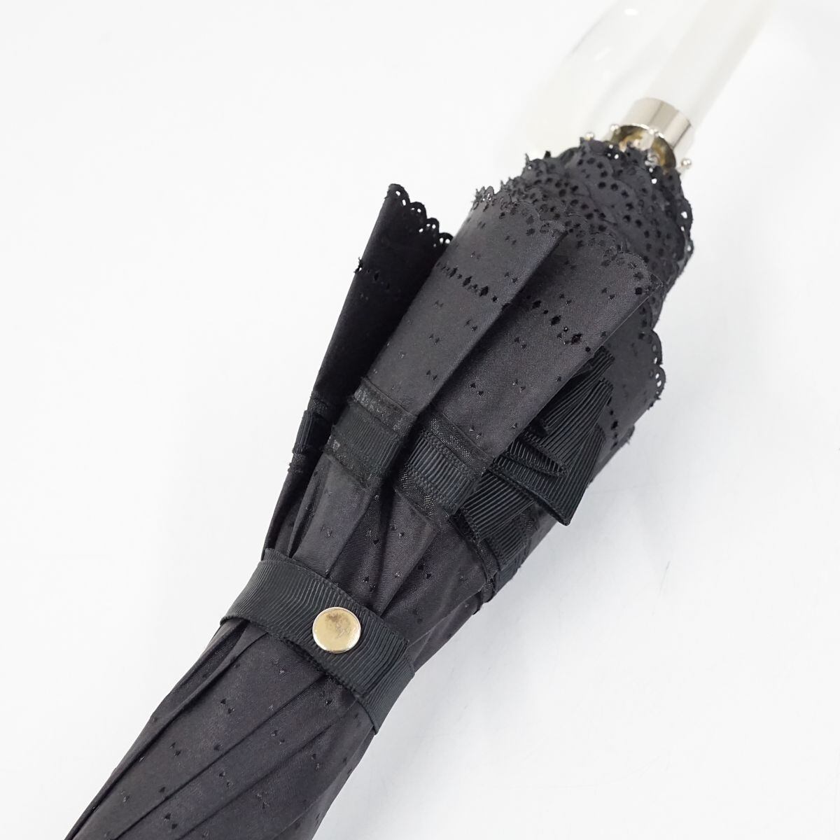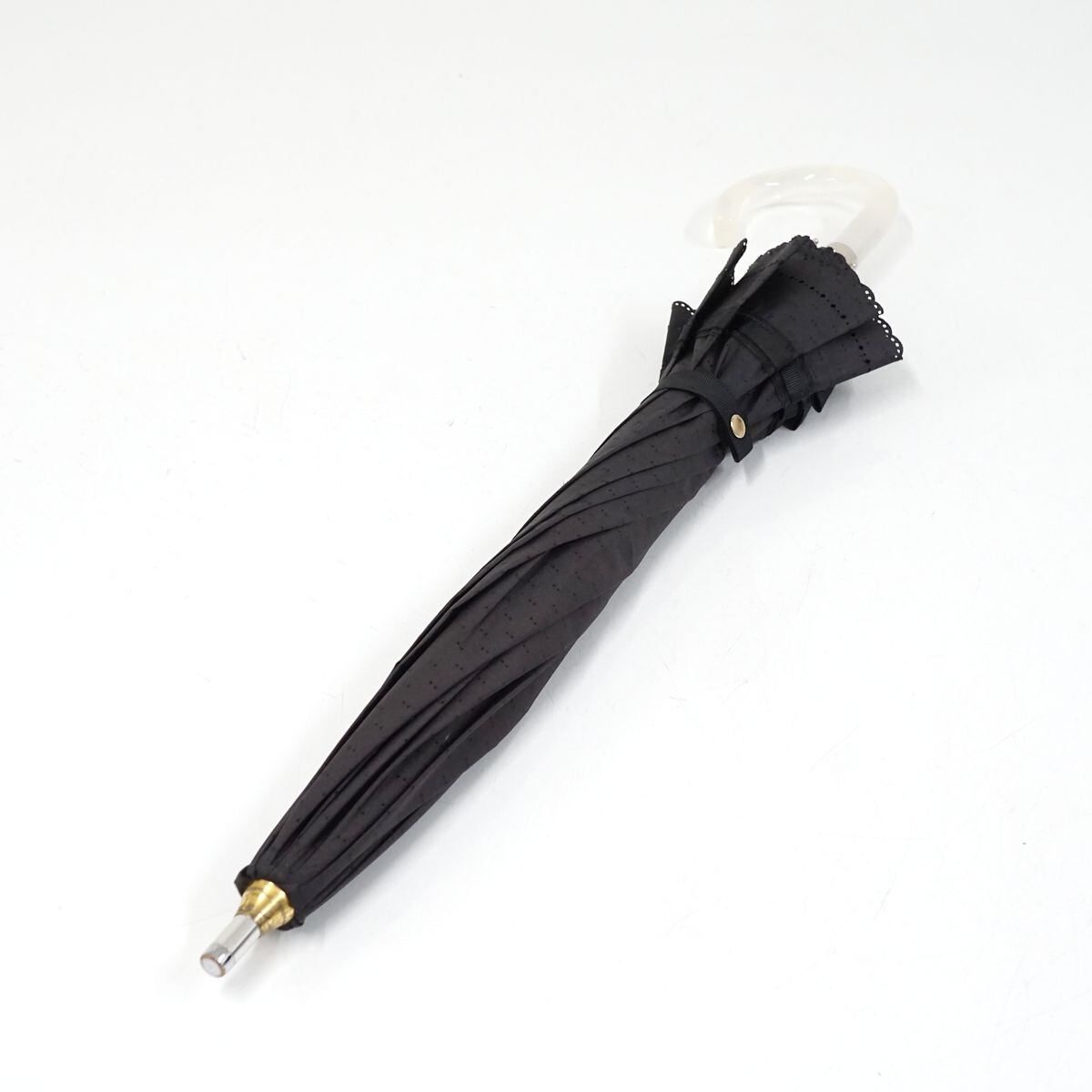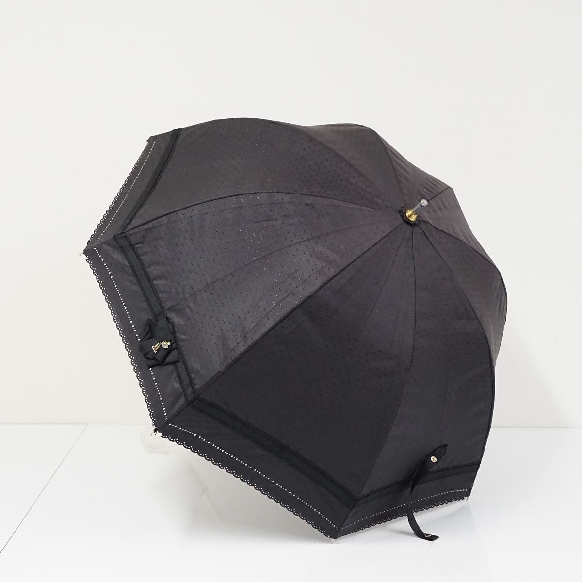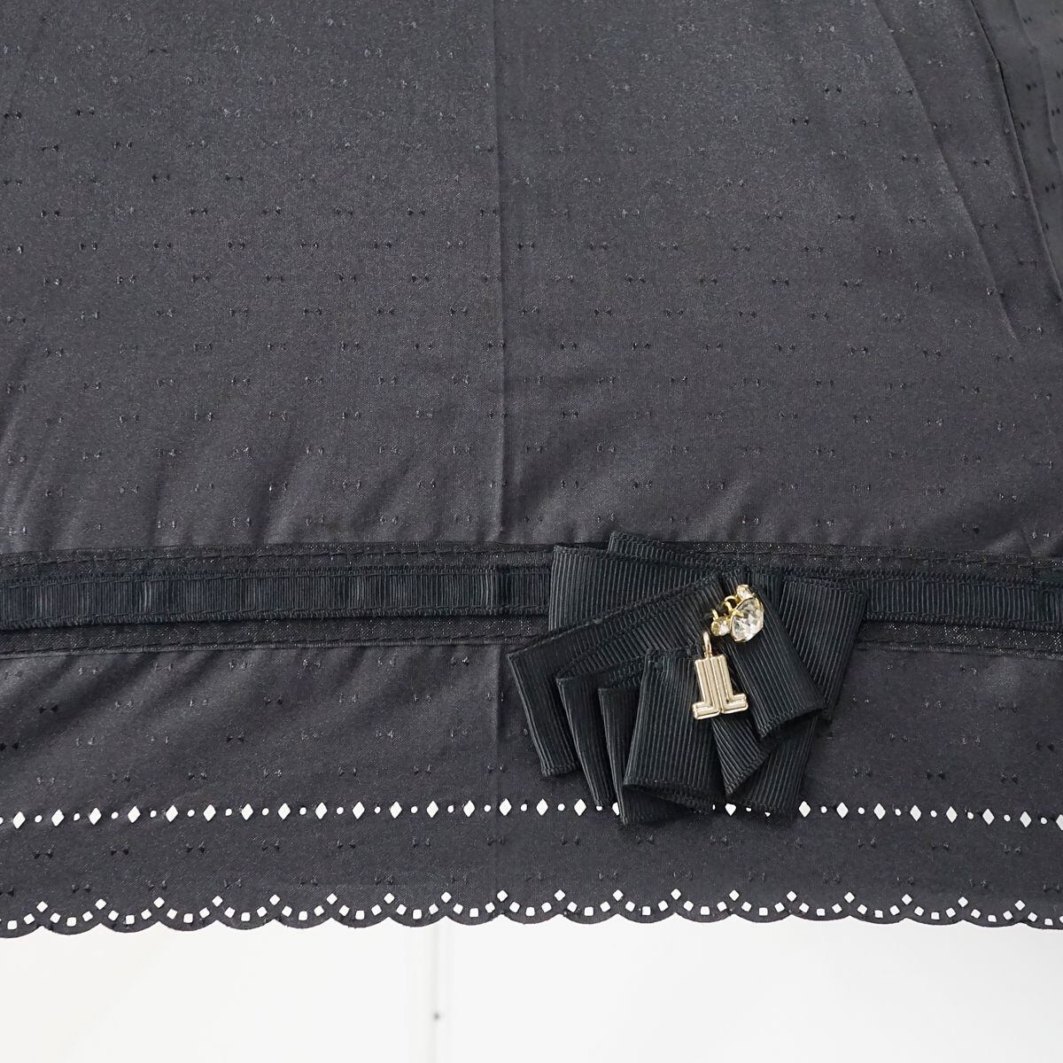 晴雨兼用日傘 LANVIN en Bleu ランバンオンブルー USED美品 グログランリボン ビジュー ロゴチャーム スカラップ グラス骨 UV 47cm A1024
