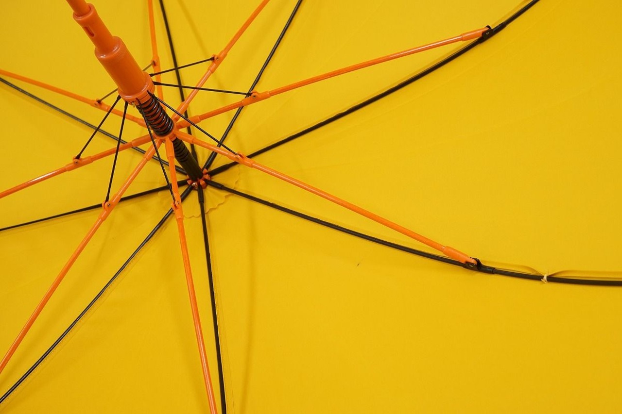 イエローの生地に、ワンポイントのロゴと一小間のみカーキのパイピングをプラスし、シャフト(中棒)・石突きをオレンジで仕上げアクセントを加えています。