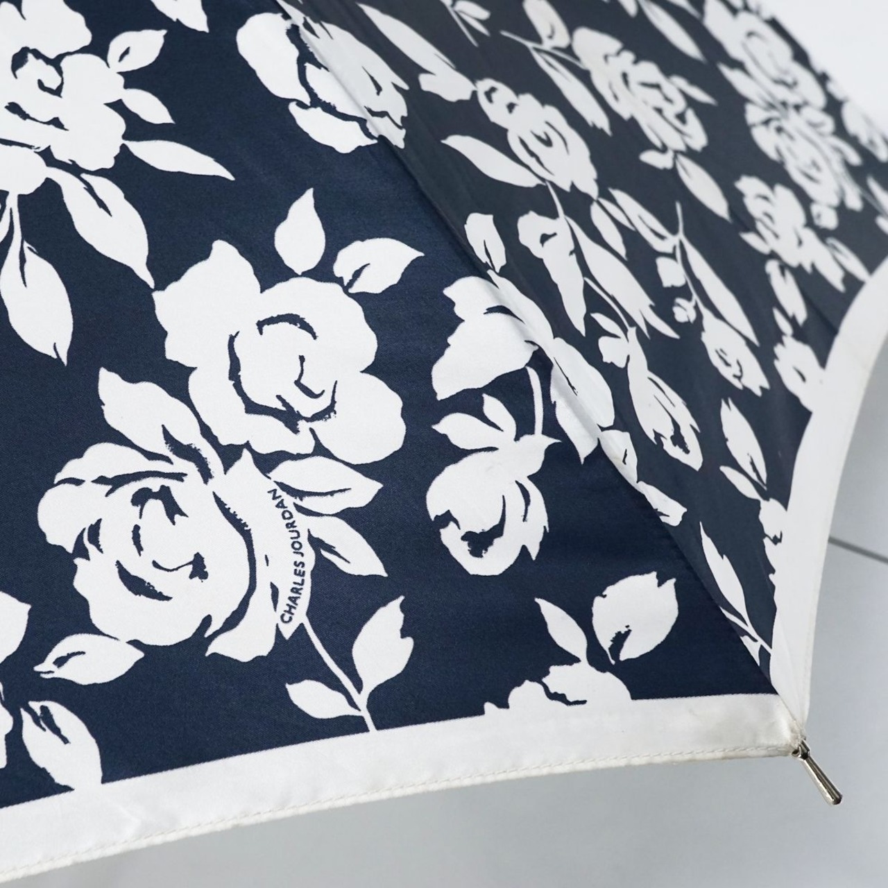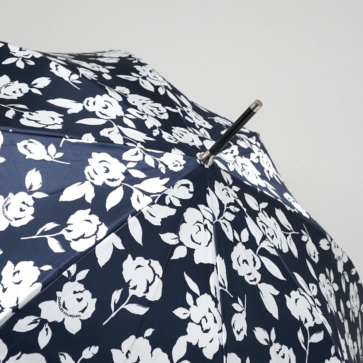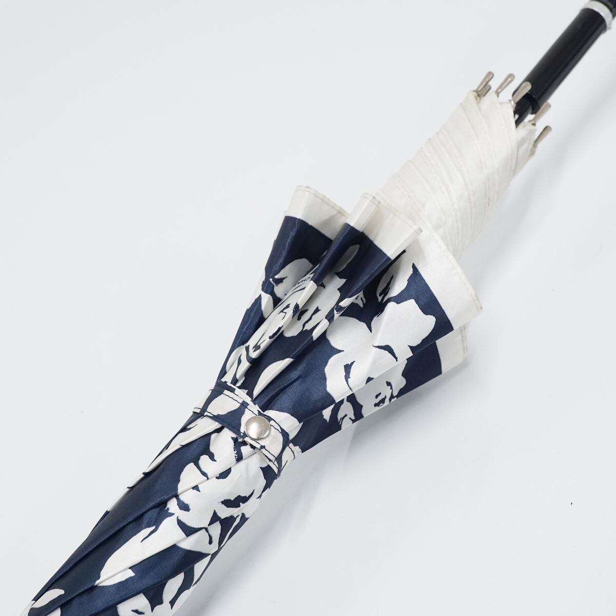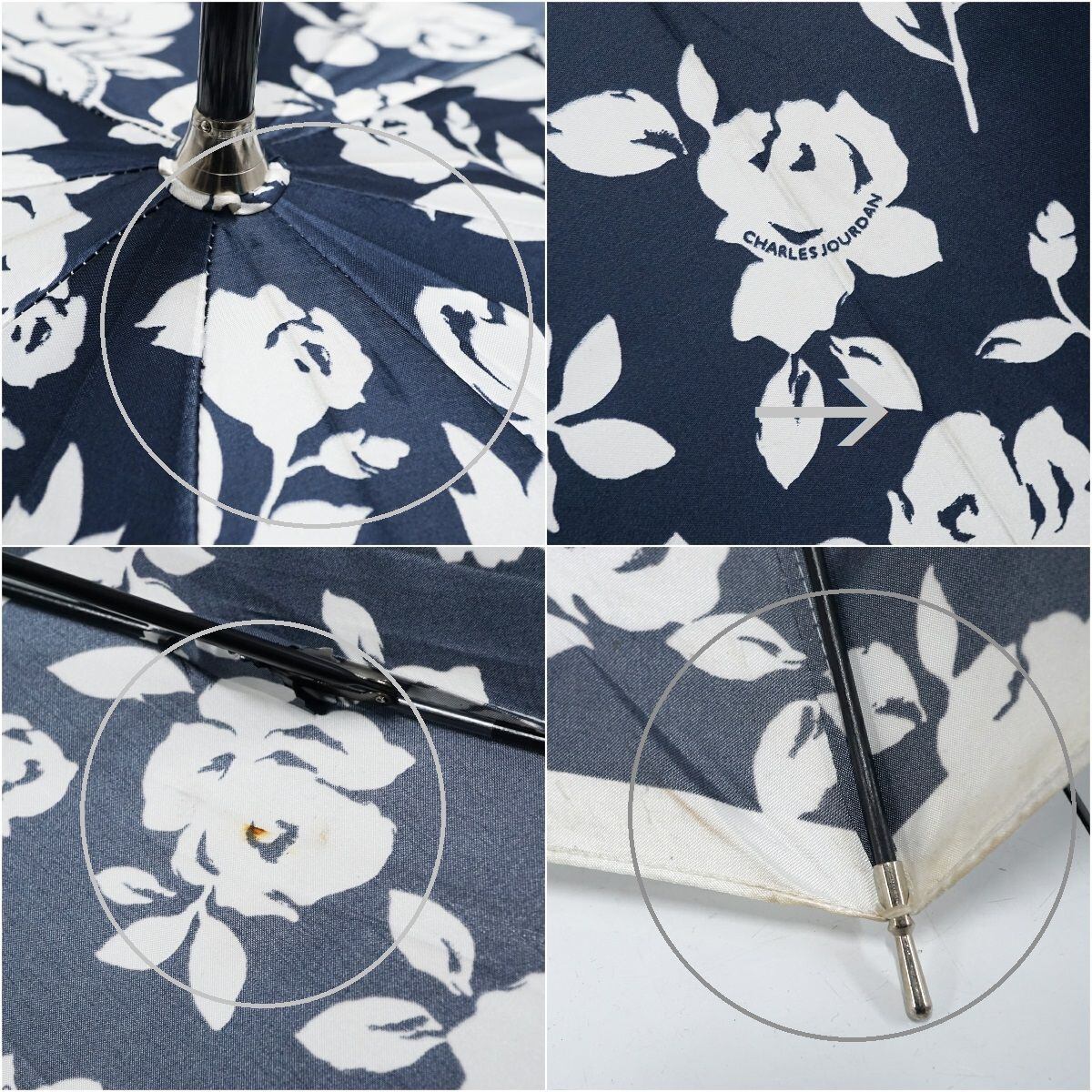 耐風傘 CHARLES JOURDAN シャルルジョルダン USED品 フラワープリント シルエット サテン ネイビー ロゴジャンプ 風に強い 60cm S A0454