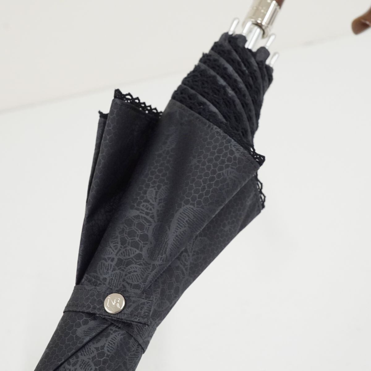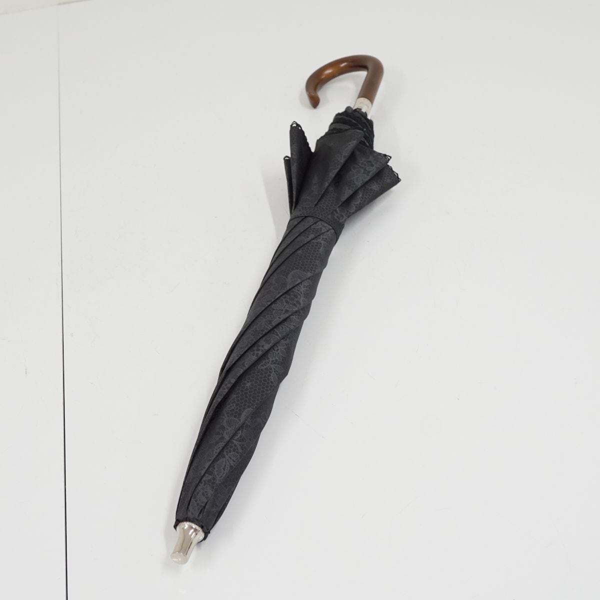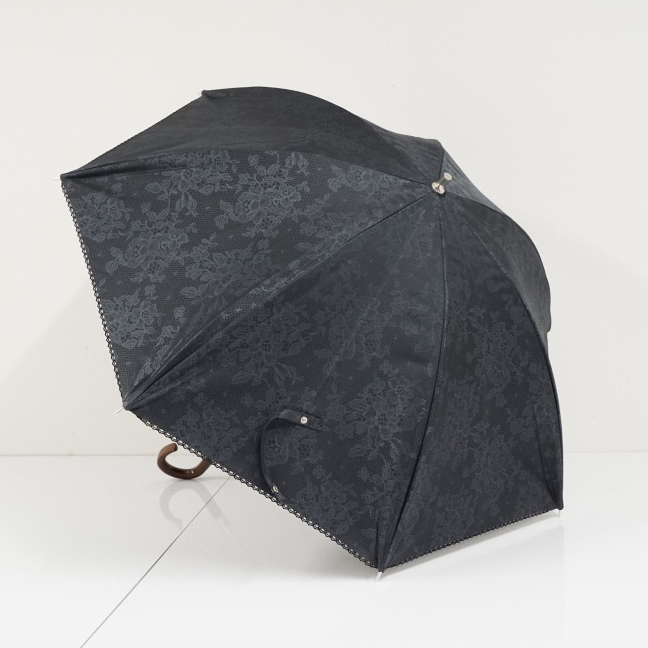 生地のカラーはブラックで、レーシーな模様がデザインされたエレガントな印象の逸品です。