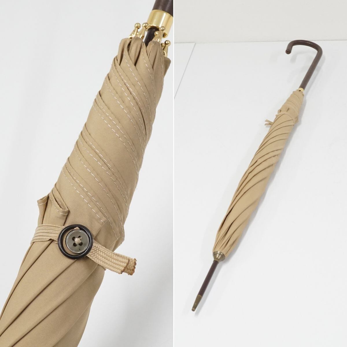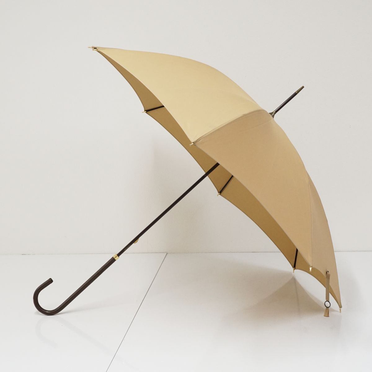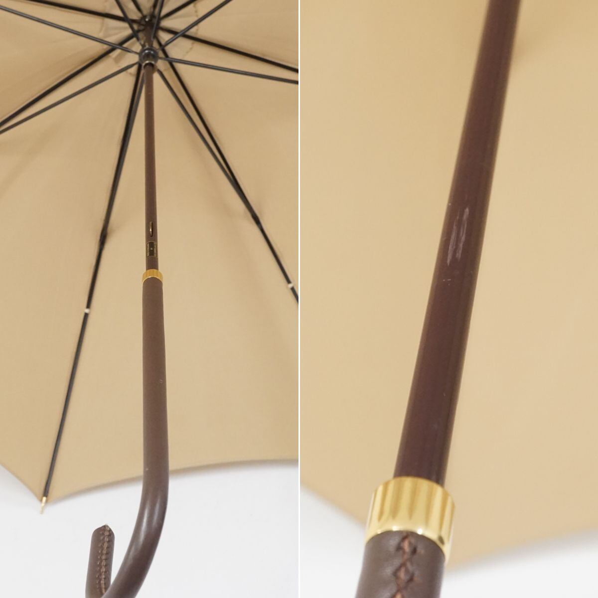 こちらはベージュ系カラーのシンプルな生地に長めのレザー手元を合わせたスタイリッシュな逸品です。