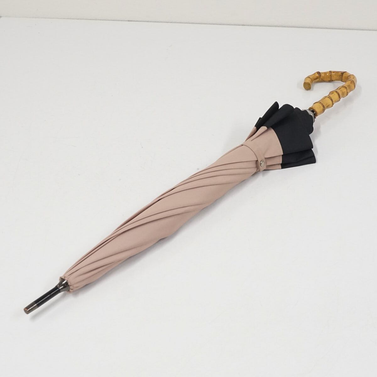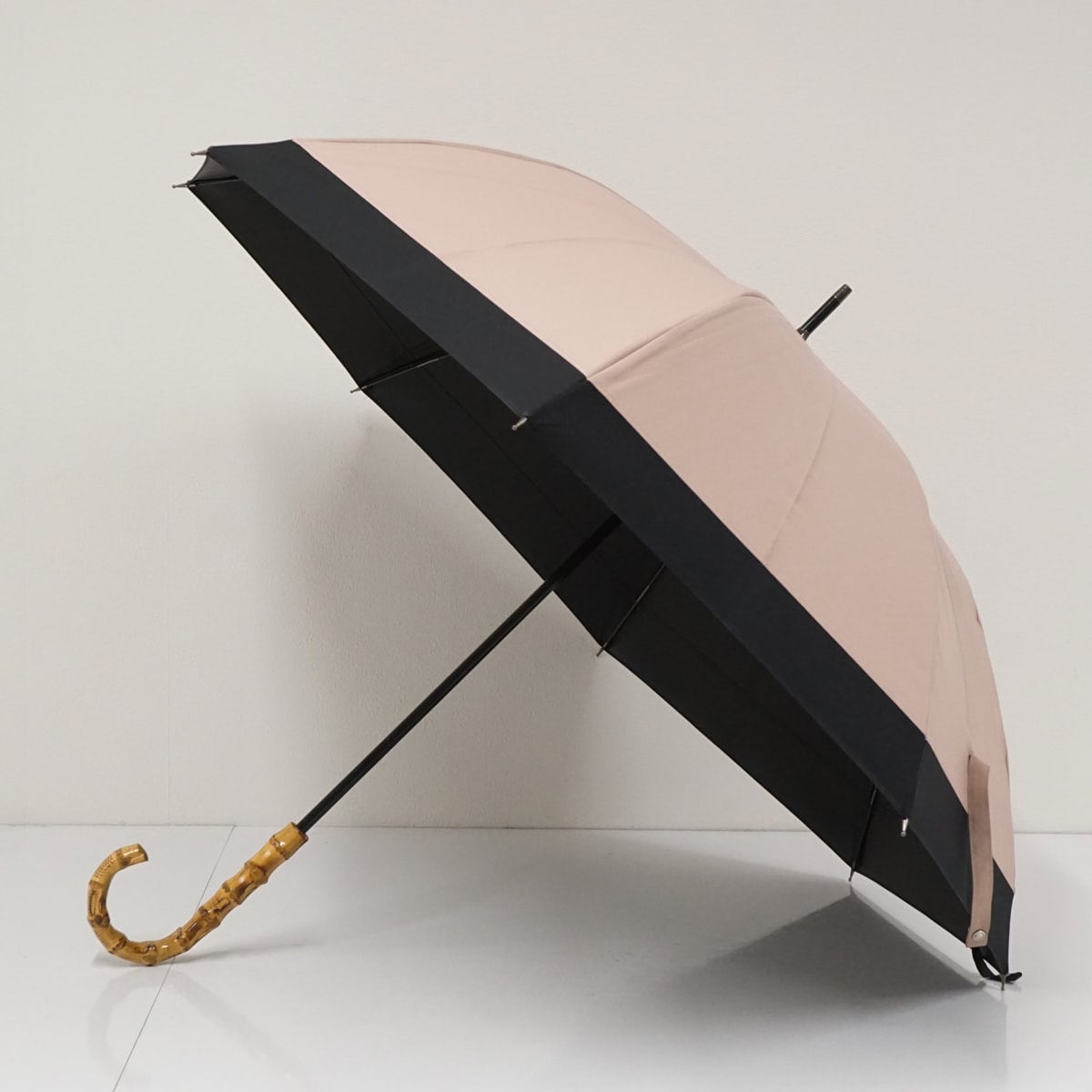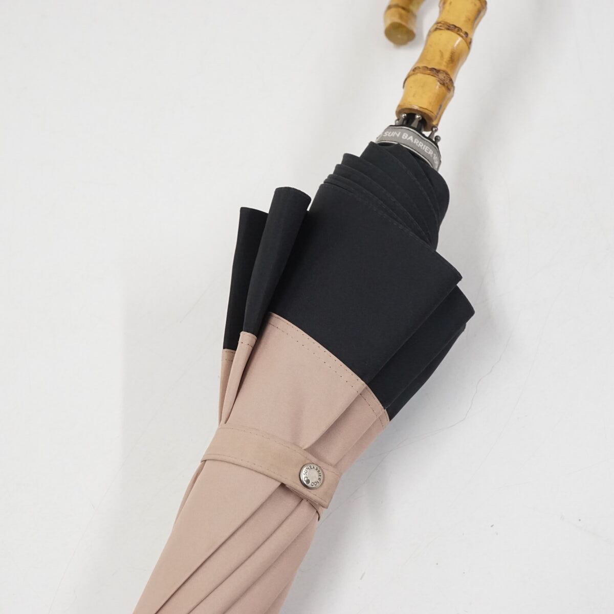 ピンク×ブラックのコンビパターンで、日傘の中では大き目のサイズ設計と上品なカラーが特徴です。